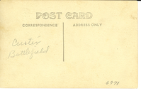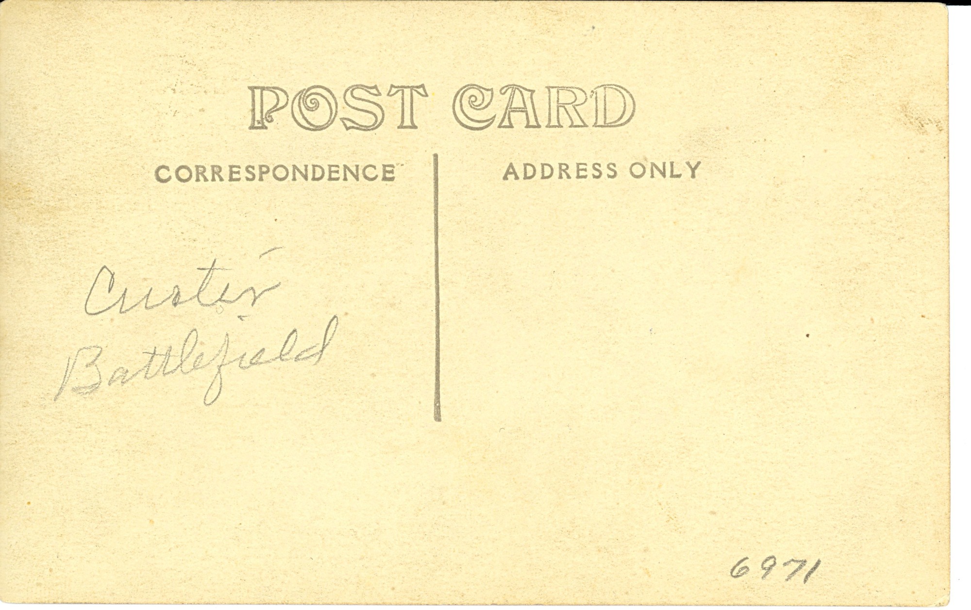 LIBI_00195_06971; Black and white photo postcard. This image depicts people scattered among the markers of the Custer Group on Last Stand Hill. The Custer Monument surrounded by an iron fence is visible in the background. A flag is at half-mast. A handwritten note along the top mount reads: “Custer Battlefield”. The word “Smith” is written in pencil in the left corner of the mount. On verso, a pencil note reads: “Custer Battlefield”. The image was taken by an unknown photographer on an unknown date. There are some stains on it. ; print, photographic; Courtesy of the National Park Service, Little Bighorn Battlefield National Monument, LIBI_00195_06971, Unknown Photographer, "People Among the Custer Group of Markers on Last Stand Hill," date unknown.
