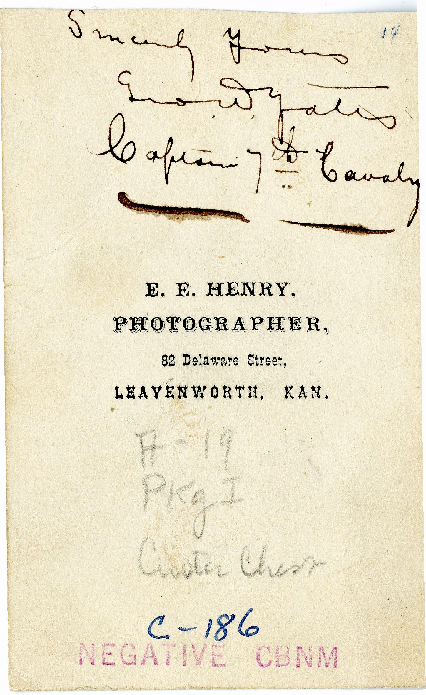 LIBI_00019_00186; This item is an albumen carte-de-visite (card-mounted photograph) of Captain George W. Yates in military dress and in a seated profile view. The photograph is 2 1/2 x 3 7/8" mounted and was produced circa 1870 by E. E. Henry of Leavenworth, Kansas. On the verso, a handwritten notation in brown/gold ink reads, "Sincerely yours/George W. Yates/Captain 7th Cavalry." The photographer's stamp is printed in black ink on the verso.Note: "Pkg I/Custer Chest" handwritten on verso.; CARTE-DE-VISITE [Card photograph]; Courtesy of the National Park Service, Little Bighorn Battlefield National Monument, LIBI_00019_00186, E. E. Henry, "Captain George Yates in Military Dress in Seated Profile," circa 1870
