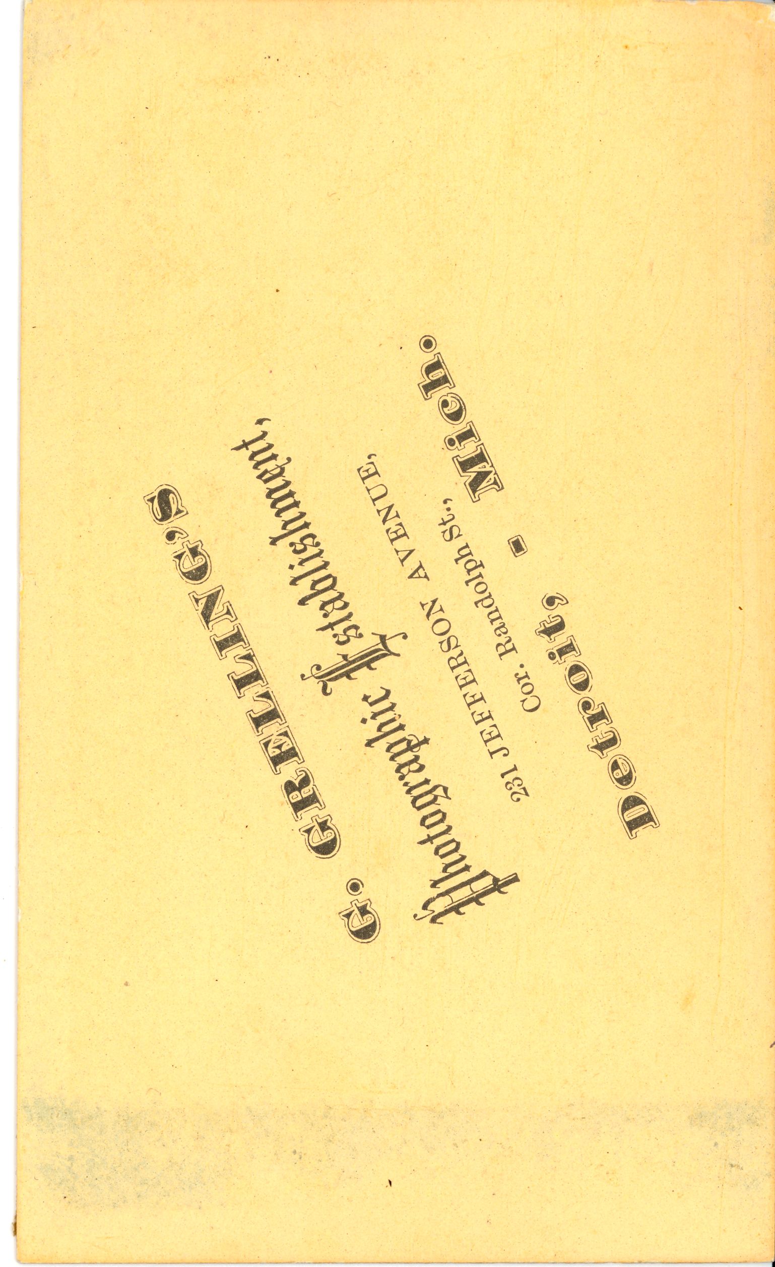 LIBI_00295_10706; A albumen portrait on an orange card with a redish pinstripe. The image depicts Libbie Custer in left profile. She is wearing a white lace collar with a heavy cloak and lace epaulet. Her hair curled and tied up. The photo has faint spotting visible throughout.The verso contains a stamp reading: “G. Grellings Photographic Establishment, 231 Jefferson Ave, Cor. Randolph St., Detroit, MI.” It was taken by G.Grellings on an unknown date. ; photograph; Courtesy of the National Park Service, Little Bighorn Battlefield National Monument, LIBI_00295_10706, G. Grelling, "Portrait of Elizabeth Bacon Custer on an Orange Card," date unknown.
