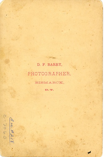 LIBI _00218_07060; Photo is black and white, sepia toned, mounted on card. This image depicts Curley, Custer's scout. Curley standing full length posed as if done in a studio with right hand on a pedestal, left hand on hip. A chair with hat on it appears to the right. Image is faded, but clear and unscratched. A printed label pasted along the bottom mount reads “General Custer’s Scout [illegible] of that Horrible Massacre.” The verso has “D.F. Barry Photographer, Bismarck, D.T.” printed in red.; print, photographic; Courtesy of the National Park Service, Little Bighorn Battlefield National Monument, LIBI_00218_07060, D. F. Barry, "Curly in Jacket with Blanket Wrapped Around His Waist," date unknown.