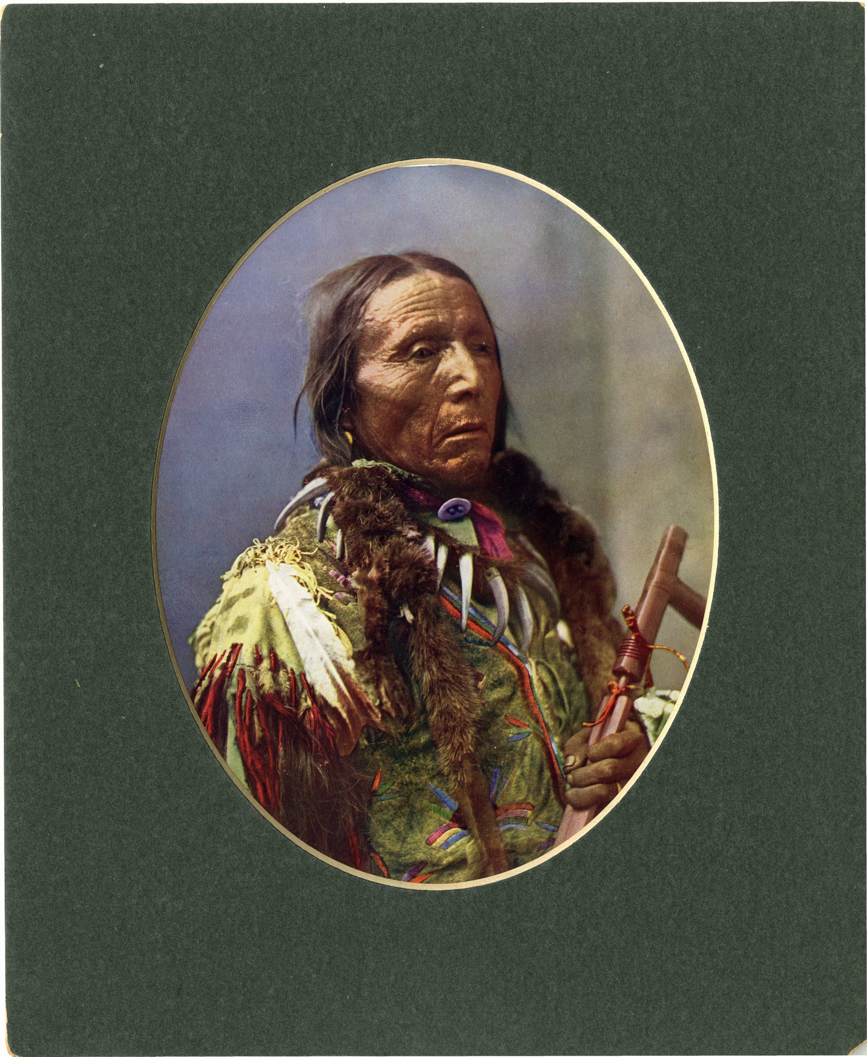 A color, offset lithograph print with grey mat; depicts a Sioux warrior Shot in the Eye, originally in the Battle of Little Bighorn; by unknown artist; created on unknown date.
