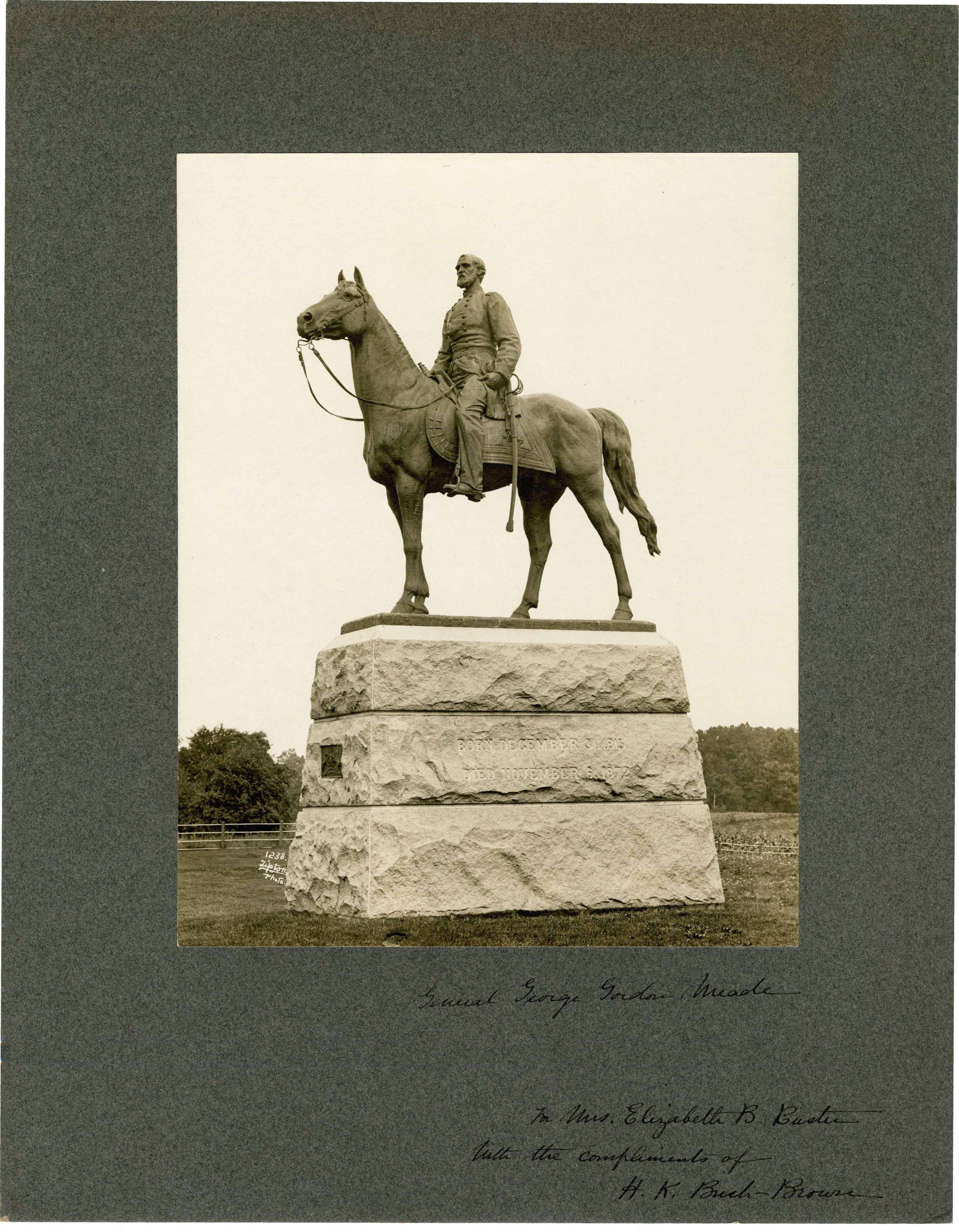 LIBI_00019_00555; A photograph, mounted on grey mat board, of full view of statue of General George G. Meade; by [H. K. Bush-Brown]; created on unknown date. Autographed to Elizabeth B. Custer by photographer on the lower right side of mat.; Print, Photographic [Mounted on Card]; Courtesy of the National Park Service, Little Bighorn Battlefield National Monument, LIBI_00019_00555, H. K. Bush-Brown, "Statue of George G. Meade on a Horse," date unknown.