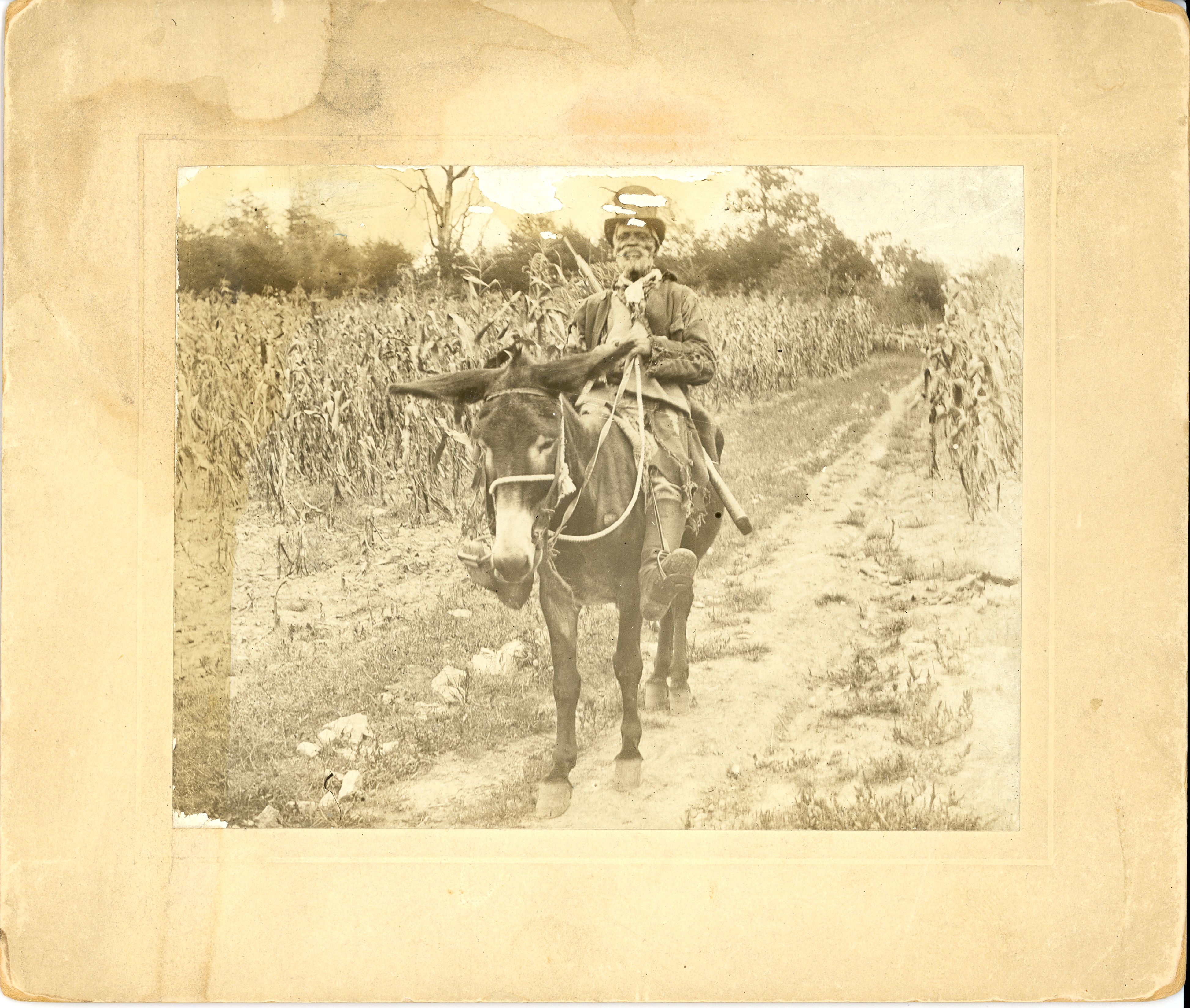 LIBI_00019_00238; This item is a card-mounted photograph of an unidentified man (possibly Senator Bradford) on a mule, riding through a corn field. The photograph is 3 1/2 x 4 1/2" (5 1/2 x 6 1/2" mounted on a tan mount) and was produced circa 1865 by an unknown photographer. The subject of the photograph is a black man with a white beard and wearing ragged clothing, stovepipe hat and cavalry boots. He is armed with a musket and the improvised bridle on the mule is made of rope and leather. ; PRINT, PHOTOGRAPHIC [Mounted on card]; Courtesy of the National Park Service, Little Bighorn Battlefield National Monument, LIBI_00019_00238, Unknown Photographer, "Man on a Mule in a Cornfield," circa 1865