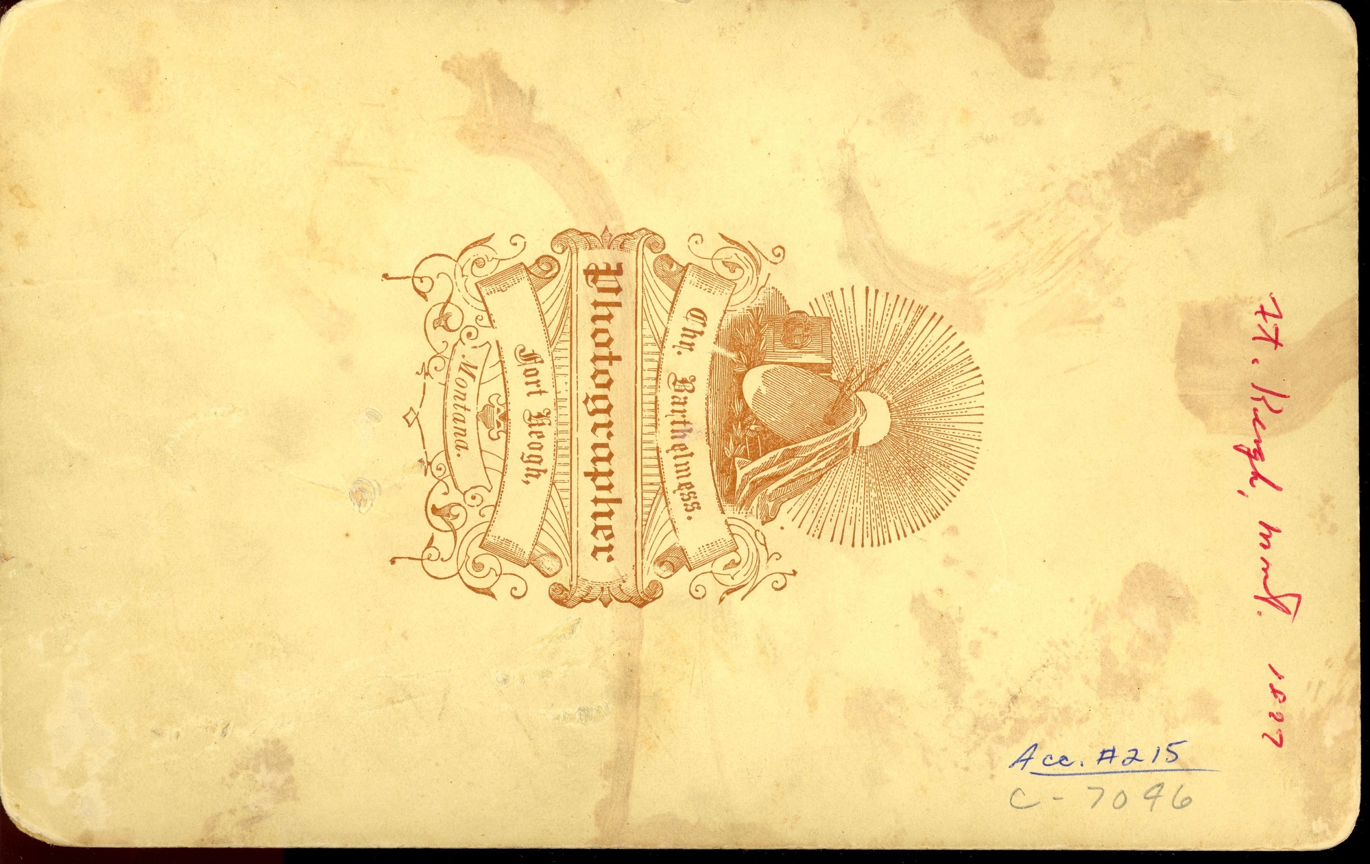 LIBI_00215_07046; Photo is black and white, mounted on card; 5" x 8". This image depicts about 35 soldiers standing in front of square and conical camp tents. Another 10 soldiers are visible in the back left. Image is scratched.The verso depicts the seal of the Chr. Barthelmess, photographer, Fort Keogh, Montana. "Ft. Keogh, Mont. 1877" appears in red ink above the seal. ; print, photographic; Courtesy of the National Park Service, Little Bighorn Battlefield National Monument, LIBI_00215_07046, Christian Barthelmess, "Soldiers from Fort Keogh Standing in Front of Field Tents," circa 1877.