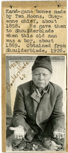 LIBI_00012_07529; A black-and-white photograph, mounted on cardboard, of Shoulderblade holding hand-game bones; produced in 1927 when Shoulderblade was 68. Description states that the hand-game bones were made by Two Moons, Cheyenne chief in about 1858. He gave them to Shoulderblade when this old man was a boy, about 1869. Obtained from Shoulderblade in 1926. ; print, photographic [mounted on card]; Courtesy of the National Park Service, Little Bighorn Battlefield National Monument, LIBI_00012_07529, Thomas B. Marquis, "Shoulderblade Holding Handgame Bones," 1927