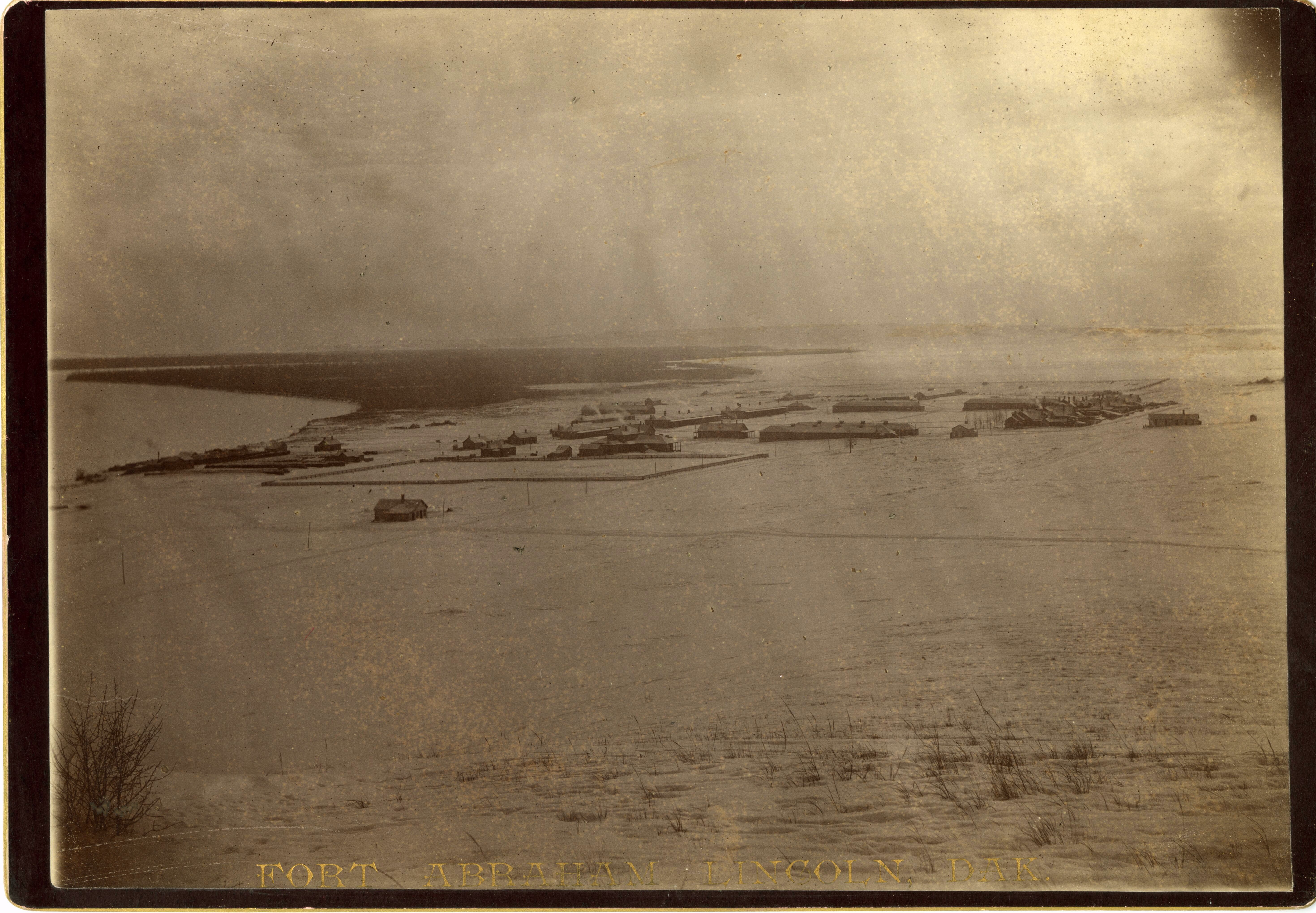 LIBI_00019_00213; This item is a card-mounted albumen photograph of a landscape view of Fort Lincoln, D.T. The imperial view photograph is 6 3/4 x 9 3/4" and was produced circa 1886 by David F. Barry. This image is nearly identical to catalog number 212. On the front, a typed caption embossed in gold on the image itself reads, "Fort Abraham Lincoln, Dak." On the verso, a handwritten notation in pencil reads, "Fort Abraham Lincoln 1886." The photographer's stamp is printed in brown ink on the verso.; PRINT, PHOTOGRAPHIC [Mounted on card]; Courtesy of the National Park Service, Little Bighorn Battlefield National Monument, LIBI_00019_00213, D. F. Barry, "Landscape View of Fort Lincoln, Dakota Territory," circa 1886