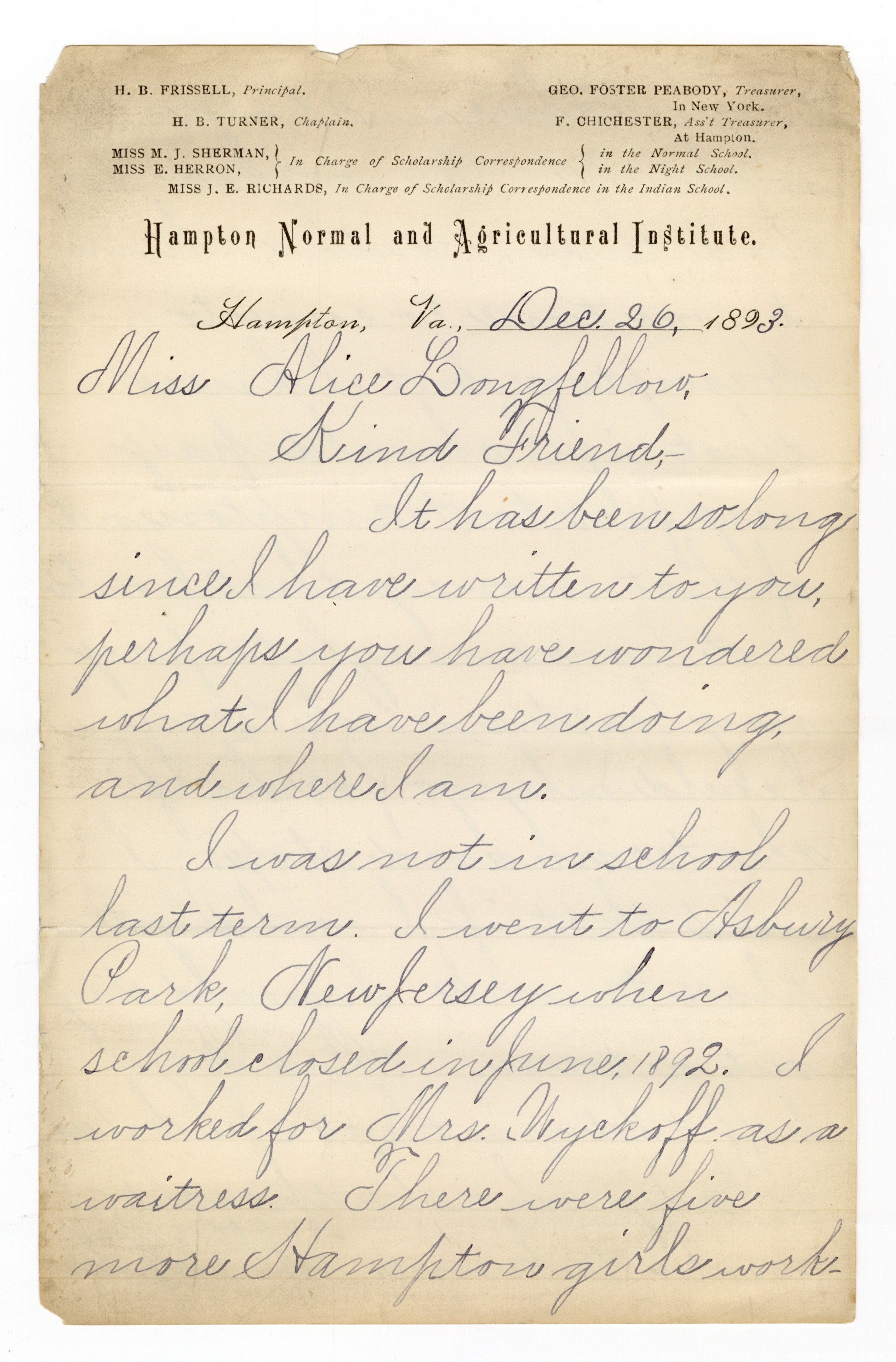 I was not in school last term. I went to Asbury Park, New Jersey when school closed in June, 1892. I worked for Mrs. Wyckoff as a waitress. There were five more Hampton girls work- [p. 2] ing in the same house with me. We worked there three months, then it was time to come to Hampton, but I knew that if I should pay my fair to Hampton out of that money that I would not have enough to pay my board a whole term. I could only go for half the term and stop. I said that if I could get a place to work, I would stay out a term. Mrs. Wyckoff told me that she knew a lady who she thought would take me. She spoke [p. 3] to her about me. The lady came around to see me. She thought that we could get on alright together, and agreed to take me. I stayed there one year, and I am sure I liked the place very much.
