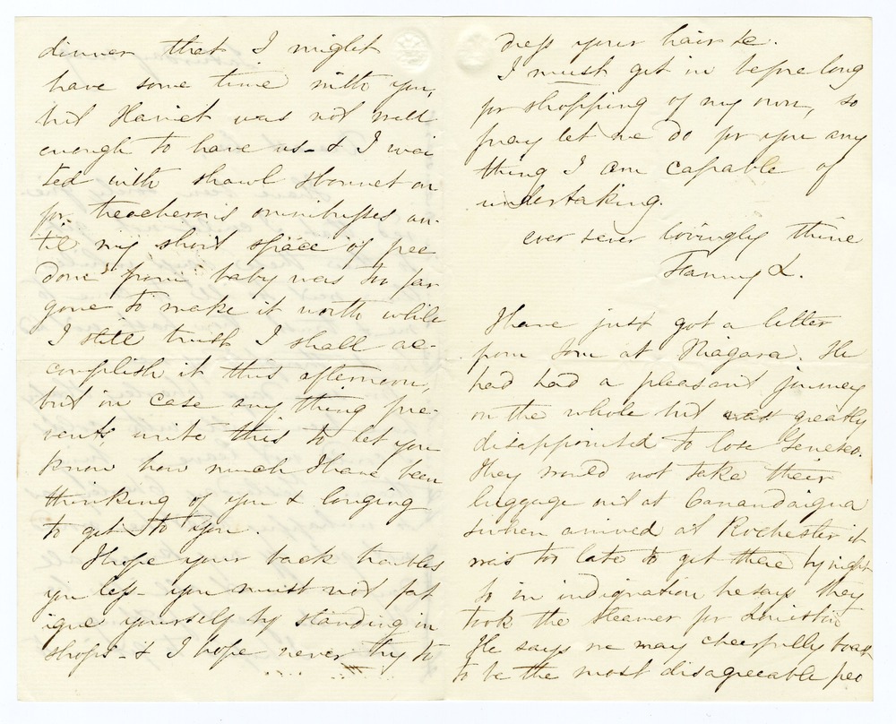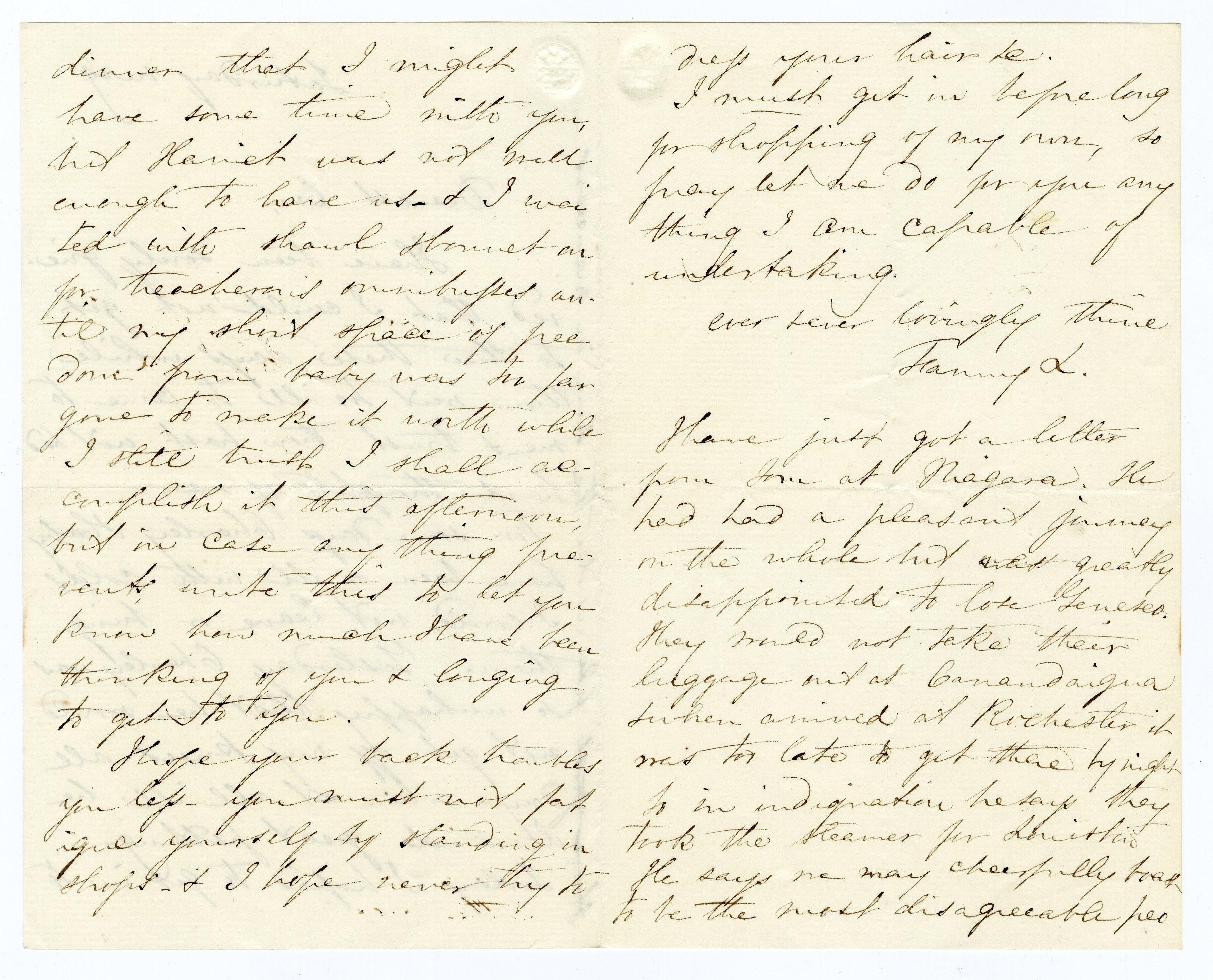 I have just got a letter from Tom at Niagara. He had had a pleasant journey on the whole but was greatly disappointed to lose Geneseo. They would not take their luggage out at Canandaigua & when arrived at Rochester it was too late to get there by night So in indignation he says they took the steamer for Louiston He says we may cheerfully boast to be the most disagreeable peo [p. 1 cross] [crossed out: I have just] ple under the sun, in manners –