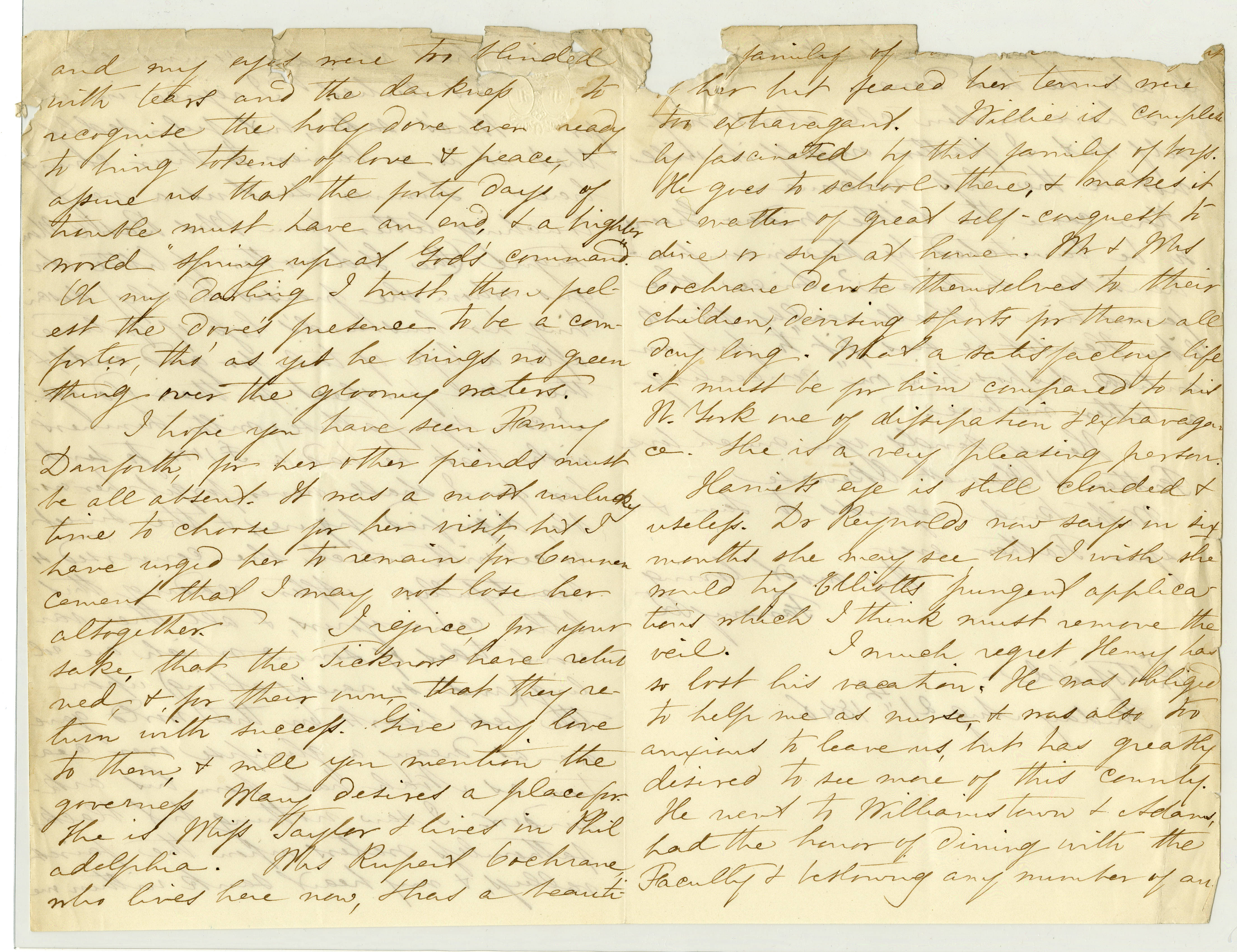 Harriet’s eye is still clouded & useless. Dr Reynolds now says in six months she may see, but I wish she would try Elliotts pungent applications which I think must remove the veil. I much regret Henry has so lost his vacation. He was obliged to help me as nurse, & was also too anxious to leave us, but has greatly desired to see more of this country. He went to Williamstown & Adams, had the honor of dining with the Faculty & bestowing any number of an [p. 8] [top edge torn, words lost] [s]tudents, but is all he has done.