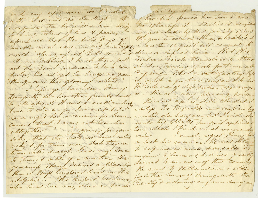 I hope you have seen Fanny Danforth, for her other friends must be all absent. It was a most unlucky time to choose for her visit, but I have urged her to remain for Commencement that I may not lose her altogether. I rejoice, for your sake, that the Ticknors have returned, &, for their own, that they return with success. Give my love to them, & will you mention the governess Mary desires a place for. She is Miss Taylor & lives in Philadelphia. Mrs Rupert Cochrane, who lives here now, & has a beauty- [p. 7] [ful] family of [top edge torn off] [of] her but feared her terms were too extravagant. Willie is completely fascinated by this family of boys. He goes to school there, & makes it a matter of great self-conquest to dine or sup at home. Mr & Mrs Cochrane devote themselves to their children, devising sports for them all day long. What a satisfactory life it must be for him compared to his N. York one of dissipation & extravagance. She is a very pleasing person.