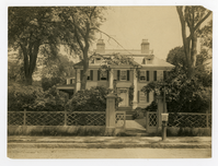 South facade of Longfellow House taken from inside fence, 1900-1920