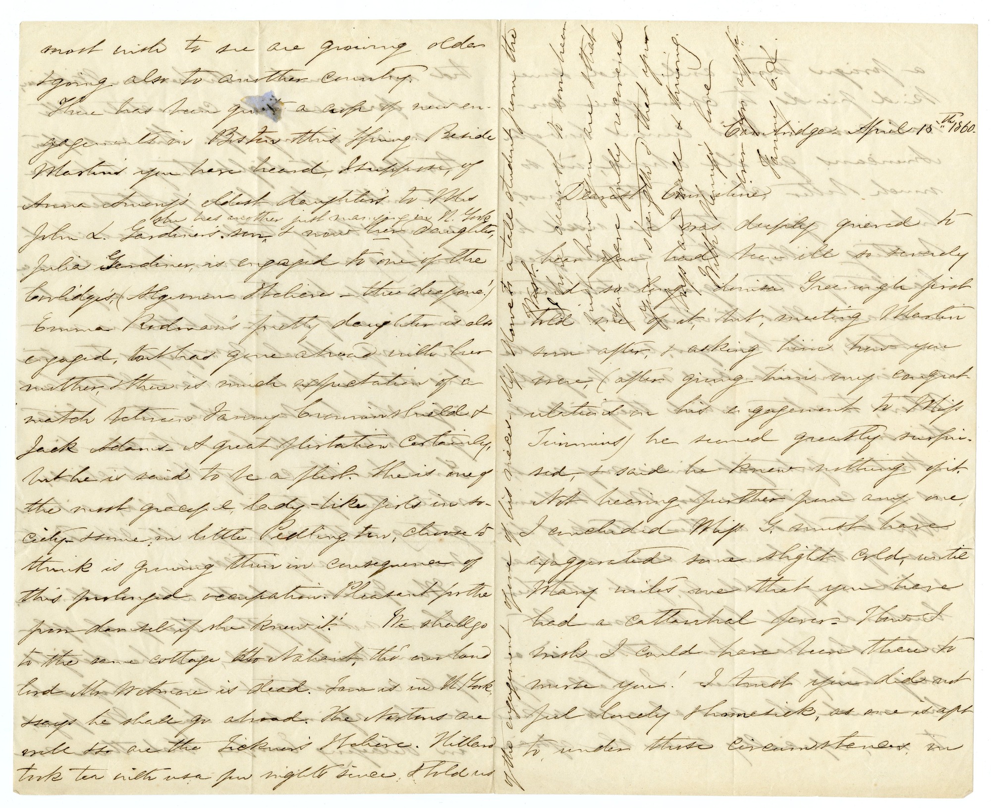 There has been quite a coup of new engagements in Boston this Spring. Beside Martin’s you have heard, I suppose, of Anna Amory’s oldest daughter’s to Mrs John L. Gardiner’s son (she has another just marrying in N. York & now her daughter, Julia Gardiner, is engaged to one of the Coolidge’s, (Algernon I believe – the deaf one!) Emma Rodman’s pretty daughter is also engaged, but has gone abroad with her mother, & there is much expectation of a match between Fanny Crowninshield & Jack Adams. A great flirtation certainly, but he is said to be a flirt. She is one of the most graceful, lady-like girls in society - & some in little Pedlington, choose to think is growing thin in consequence of this prolonged occupation. Pleasant for the poor damsel if she knew it! We shall go to the same cottage at Nahant, tho’ our land lord Mr Wetmore is dead. Tom is in N York, & says he shall go abroad. The Nortons are well & so are the Ticknor’s I believe. Hillard took tea with us a few nights since & told us [p. 1 cross] of the engagement of one of his nieces – Miss Howe to a tall student from the West.