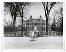 Black and white photo, Georgian mansion with front lawn covered in snow.