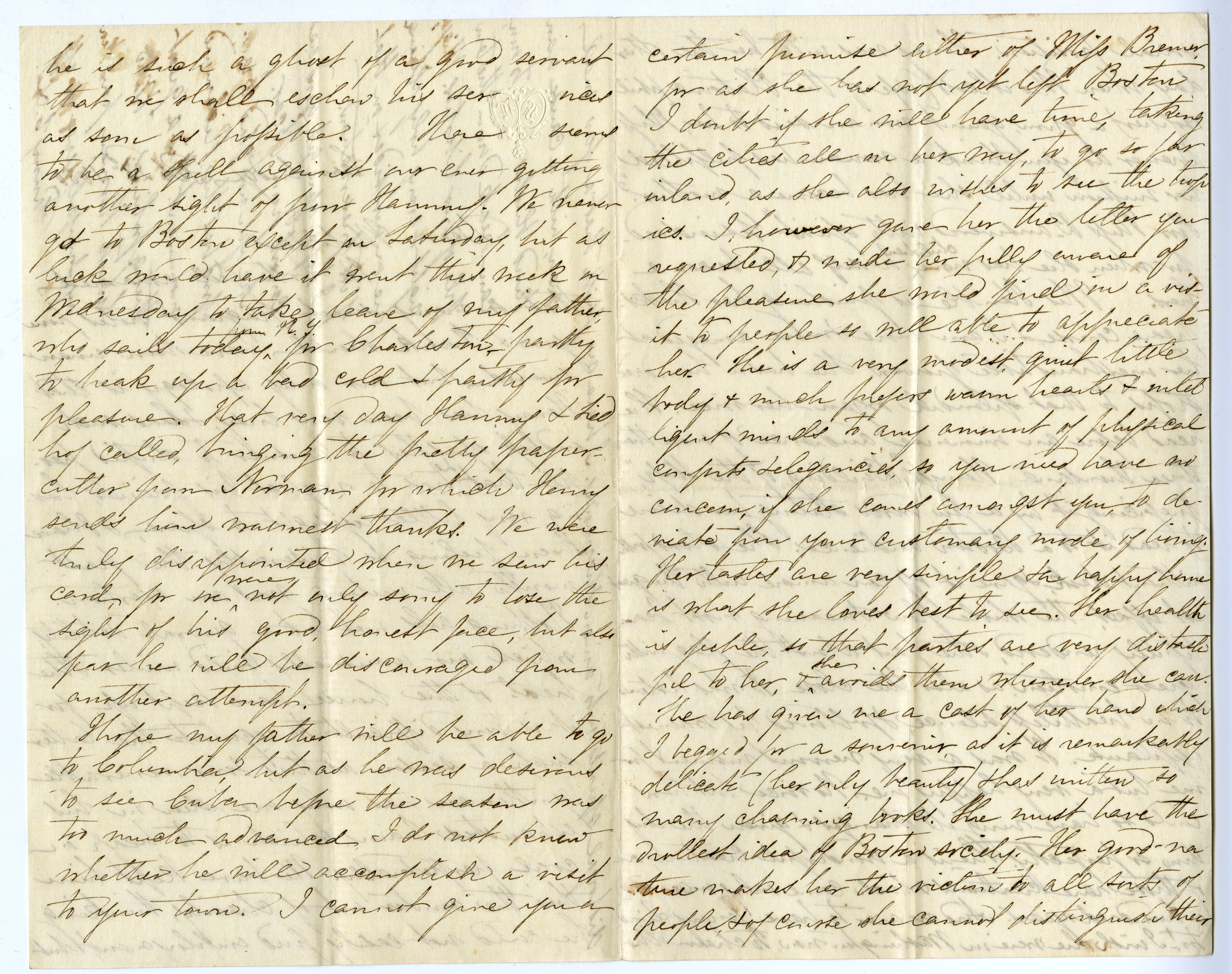 I hope my father will be able to go to Columbia, but as he was desirous to see Cuba before the season was too much advanced, I do not know whether he will accomplish a visit to your town. I cannot give you a [p. 3] certain promise either of Miss Bremer, for as she has not yet left Boston I doubt if she will have time, taking the cities all on her way, to go so far inland, as she also wishes to see the tropics. I however gave her the letter you requested, & made her fully aware of the pleasure she would find in a visit to people so well able to appreciate her. She is a very modest, quite little body & much prefers warm hearts & intelligent minds to any amount of physical comforts & elegancies, so you need have no concern, if she comes amongst you, to deviate from your customary mode of living. Her tastes are very simple & a happy home is what she loves best to see. Her health is feeble, so that parties are very distasteful to her, & she avoids them whenever she can. She has given me a cast of her hand which I begged for a souvenir, as it is remarkably delicate (her only beauty) & has written so many charming books. She must have the drollest idea of Boston society. Her good-nature makes her the victim to all sorts of people, & of course she cannot distinguish their [p. 4] social position. Henry was with her the other day when Mrs Alcott (wife of the Platonic philosopher) a grim, gaunt woman said to her, “Miss Bremer do you think a woman has fulfilled her mission until she has become a mother?” Poor Miss B. answered with spirit “Yes indeed – for when she has no[crossed out:ne] children herself all become hers.” Mrs Kemble is finishing her Shakspeare course, & I am more & more amazed at her inexhaustible powers. She has a hundred stops to that splendid organ – her voice. She read, before an immense audience of more than three thousand, Henry’s “Building of the Ship,” prefacing it by a few words stating her desire to read it to a Boston audience. She stood forth without desk, & gave it off con amore with the greatest effect, the whole flow & meaning most beautifully rendered, & the part about the flag with great emotion, as also the close. It was listened to in breathless silence, & followed by warmest applause. It was a very nervous moment for me but a happy one. No voice but hers could so have rung tis changes & given the rhythm so perfectly. She is a wonderful creature, one of those rare creations which come only once in a hundred years. And we are to have Jenny Lind too! I wish she were in Washington now, to charm the [p. 1 cross] disloyal spirits into union & harmony. I have no faith that a few mad men, with a cause mankind blushes to own, can break down the temple of our liberties. Might, right & every holy alliance are on our side & on that of its preservation.