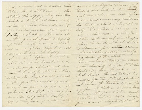 A few days before I was at a grand dinner at Emmelines, such a contrast for splendour & propriety! It was for Mrs Van Ransellaer, Mrs Thayer’s mother, & most of the guests were elderly, and arrayed in great magnificence of costume. Mrs V.R. is a very handsome old lady, with a complexion beyond the power of nature at her [p. 3] age. Mrs Bigelow Lawrence I had a chat with, in the [crossed out: lovely] pretty oval room where we had coffee & she amused me very much with her lively relations of English society. I intended to wear your dress on this occasion, but I found, at the last moment, something necessary to be done to it so had to reserve it for another evening.