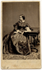 Fanny Longfellow sits with her left hand on a book. The book is placed on the Renaissance Revival style table to her side. A patterned carpet is visible. She wears a striped dark-colored dress with white collar and undersleeves. Inscription: "Fanny E. Longfellow / 1861" written in pencil underneath image. "6069 / 70" written in pencil verso. "[F]rench dress sent / by T G Appleton / black with yellow stripes" written in cursive in pencil verso. Notes: C1860. The year 1861 in the inscription may have been year the photo was taken or it may refer to year print was made and/or received. Fanny Longfellow is wearing the same dress and hair arrangement as in 3007-1-2-4-5 to -16 attributed to Black & Batchelder. The background differs in floor covering and props however; Fanny Longfellow could have been posed in two different rooms in the same session. Interestingly the table here matches the table used in a John A. Whipple carte-de-visite of Henry Wadsworth Longfellow (3007-1-2-1-15, -16). Associated Materials: 3007-1-2-4-20 identical image and format. 3007-1-2-4-17 to -20 use same background, -17, -18 having the column.