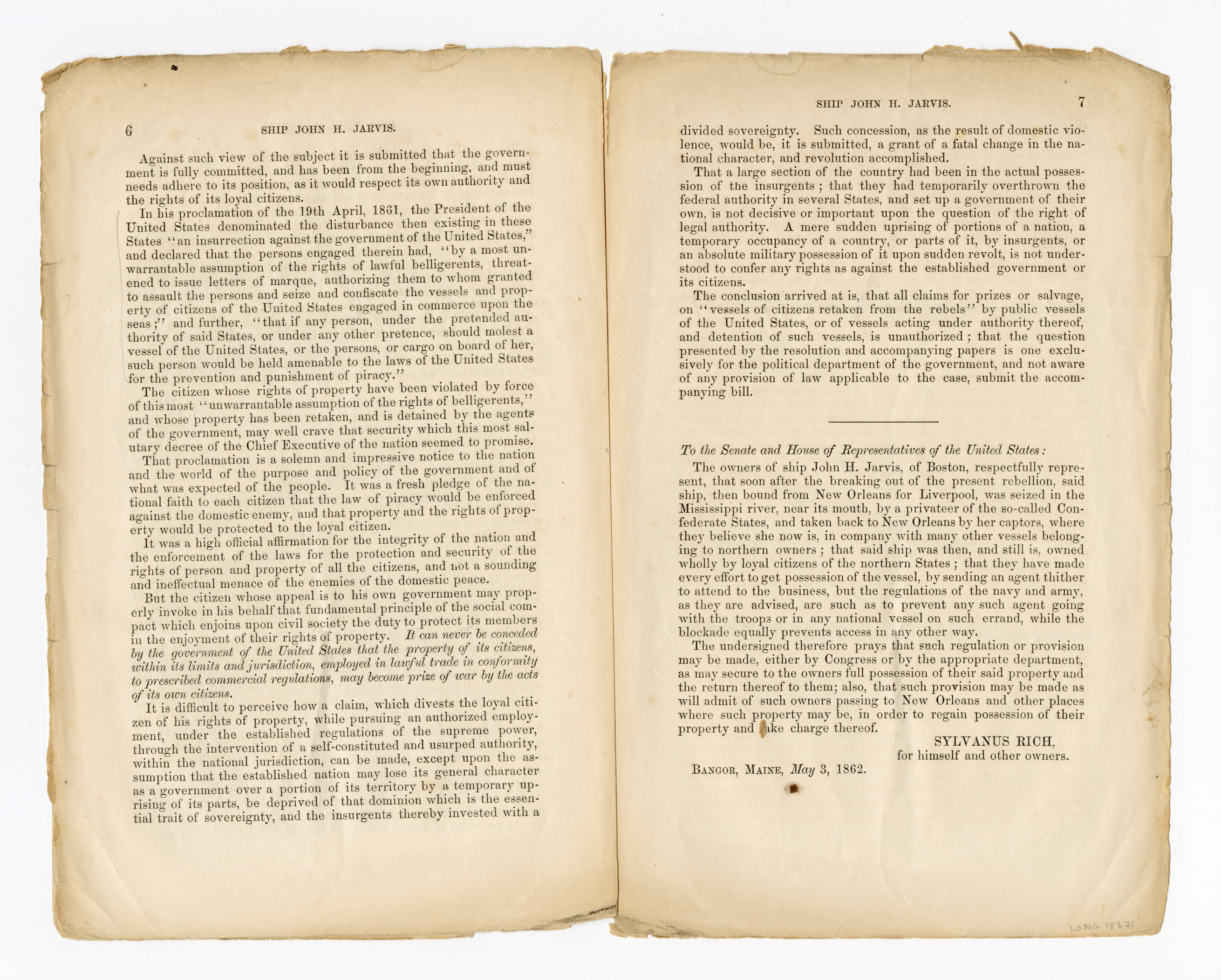 [Printed pages from the 37th Congress, 2nd session Senate, Rep Com No 57, “Mr Morrill made the following report” on Ship John H. Jarvis]