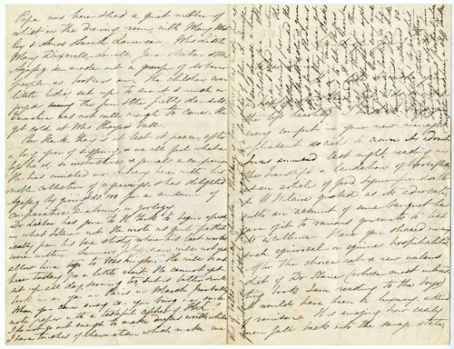 Dr Leiber has gone to N. York to begin afresh, in what I know not. He wrote us quite pathetically from his bare study, where his last works were written. Sumner’s physician will not yet allow him to go to Washington. He will be here today for a little visit. He cannot yet sit up all day, & evening too, but is better & will look in on you in Paris in March probably. When you come away can you bring me some note paper with a tasteful cipher of FEL? I do not go out enough to make dresses worth while I have touches of rheumatism which make me [p. 1 cross] shy of balls in our icy climate. Thelberg is here & Henry has made his acquaintance. Arthur Lyman is engaged to a daughter of John A. Lowell. I sent Lowell a bronze candlestick for a N. Year’s present & had in return a charming poem. The Motleys are amused that Hurlburt’s sister is grown up at Emma Rodman’s. Just as they have got a house in town Beck’s here is to let – He goes abroad. It would have been just the thing for them. Lathrop thought we ought to give a ball every week our house looked so big. Henry stands at his desk having just achieved 80 autographs! So goes his time, is stolen rather. The evergreen enfolds Sumner’s & Emerson’s portrait, whose daughter was here, a stiff ‘Yanke [p. 2 cross] girl, the other night) Charley is petting his Canary by the lemon tree, Edie shines in like a sunbeam for pencil & paper to draw wonderful faces, & Alice with a hop & a skip, her brown curls flying, - rushes for her box of paper dolls. Erny comes in, with cheeks like roses, scarf over ears, & booted in india rubber to his knees for a slice of the party’s cake, while I, in dressing-gown, am seated by the bright study fire to present this picture to you. Ever lovingly yrs