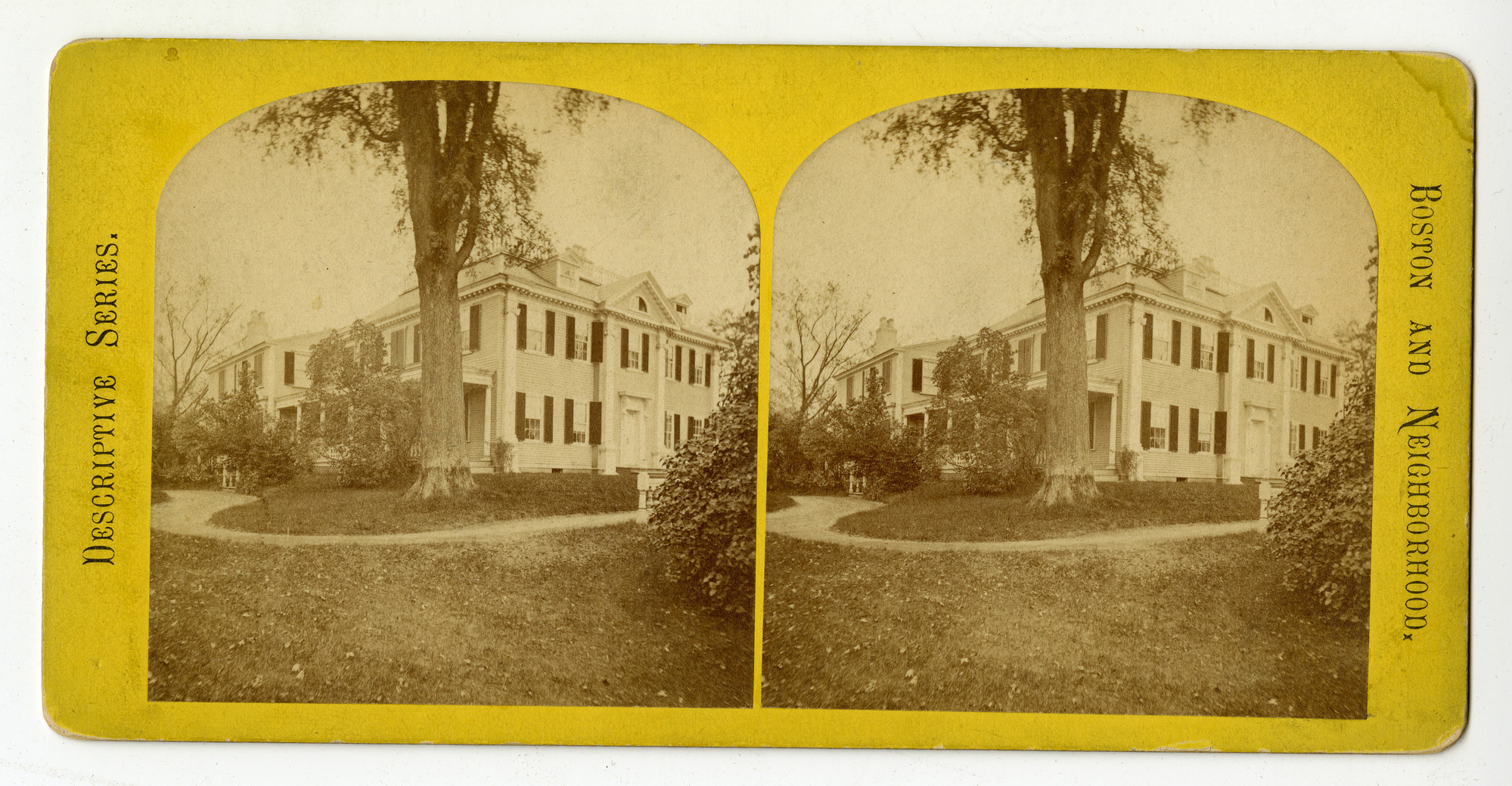 Stereograph of Longfellow House's south facade with Henry Wadsworth Longfellow and Edith (Longfellow) Dana, 1878