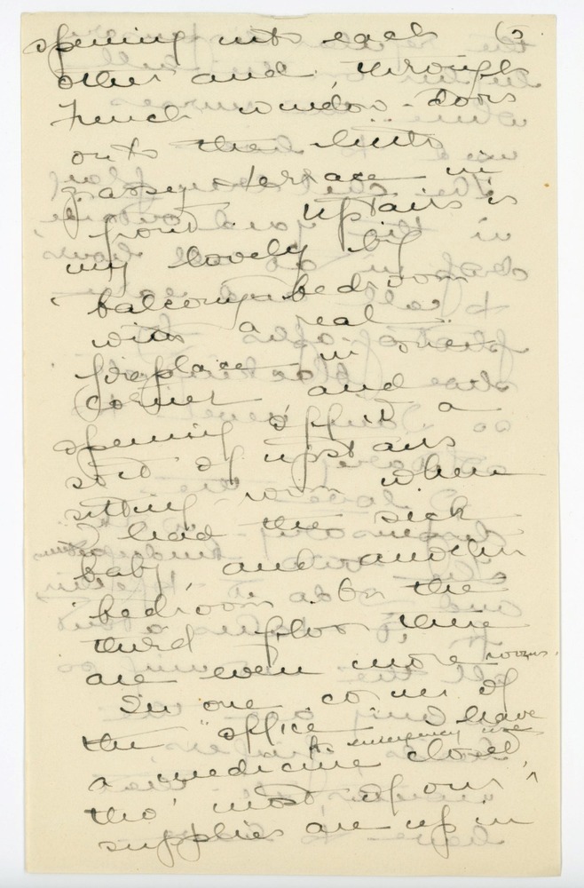 The days are getting gloriously autumnal, and some of the nights almost wintry cold. I love the peace and coziness of my little chalet under the pines, with the southeast wind from the ^sea^ sweeping down their branches, and wintry stars flashing through. Downstairs I have a little sitting room, “office,” and kitchen, the former two [p. 9 marked 5] opening into each other and, through French window doors onto the little grassy terrace in front. Upstairs is my lovely big balcony bedroom with a real fireplace in one corner and opening off it a sort of upstairs sitting room where I had the sick baby, and another bedroom. On the third floor there are even more rooms. In one corner of the “office” I have a medicine closet, ^for emergency use^ tho’ most of our supplies are up in [p. 10] the regular dispensary higher on the hill where the nurses used to live.