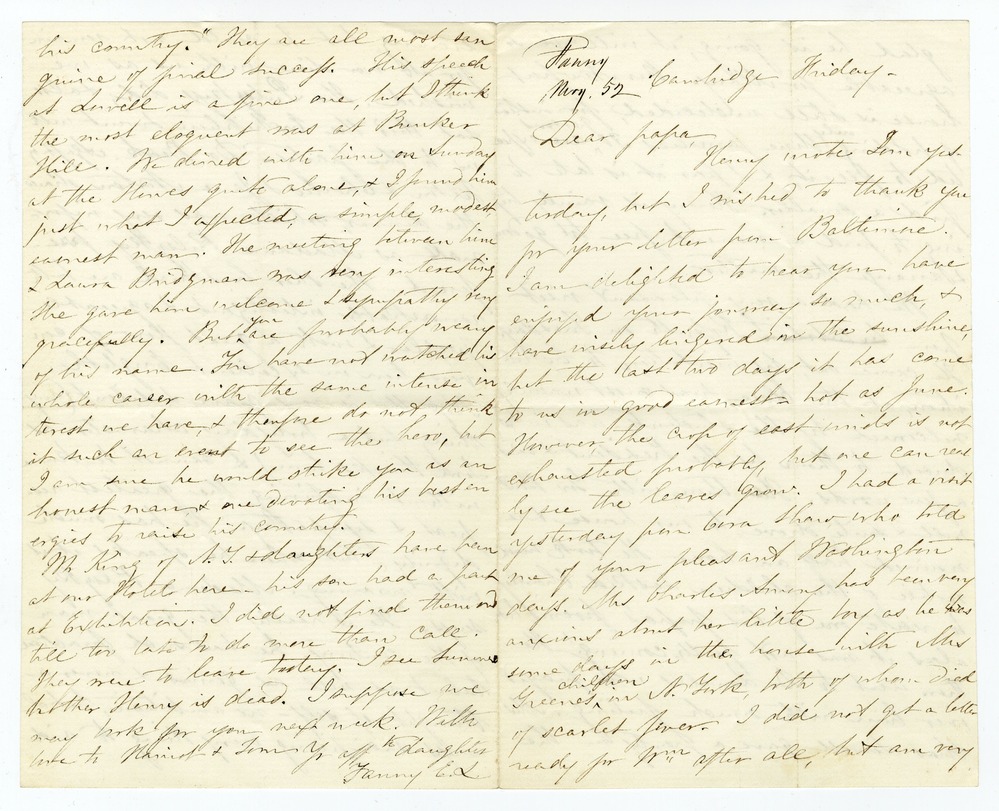 We had a very pleasant visit from [crossed out: Exhibition] Kossuth on Tuesday. He came out, by invitation, to Exhibition, at the close, & was most warmly welcomed by the students, - was introduced to them by the President & said a few words. He then, with Gov Boutwell & smile, drove to our house & remained half an hour. He took much notice of the children, & asked Charley to recite one of his papa’s poems, but alas it was not forthcoming! He then went to Dr Lowell’s who prayed over him with much feeling. Mrs Chas Lowell gave a party in the [p. 3] evening but he could not remain for it nor dine with us as we wished. The Pulzkys did, & also sat thro’ the Exhibition & went with us to the party. Dr Beck, Agassiz Felton & Charles & Jane Norton shared the dinner, which was very informall [sic] as Madam Pulszky preferred. She & her husband are both remarkably intelligent & agreeable people & with a great flow of conversation in excellent English. Kossuth is very grave & silent (any thing but a holy day character as Tom thinks him) & cannot be known without inspiring the greatest respect & sympathy. He has much dignity – but when he speaks it is with meaning. Madame Pulszky says – “He is really the great man of the century – he has such practical talent as well as genius – & never a thought of self – no ambition, but always sacrificing every thing to aid [p. 4] his country.” They are all most sanguine of final success. His speech at Lowell is a fine one, but I think the most eloquent was at Bunker Hill. We dined with him on Sunday at the Howes quite alone, & I found him just what I expected, a simple, modest, earnest man. The meeting between him & Laura Bridgman was very interesting She gave him welcome & sympathy very gracefully. But you are probably weary of his name. You have not watched his whole career with the same intense interest we have, & therefore do not think it such an event to see the hero, but I am sure he would strike you as an honest man, & one devoting his best energies to raise his country.