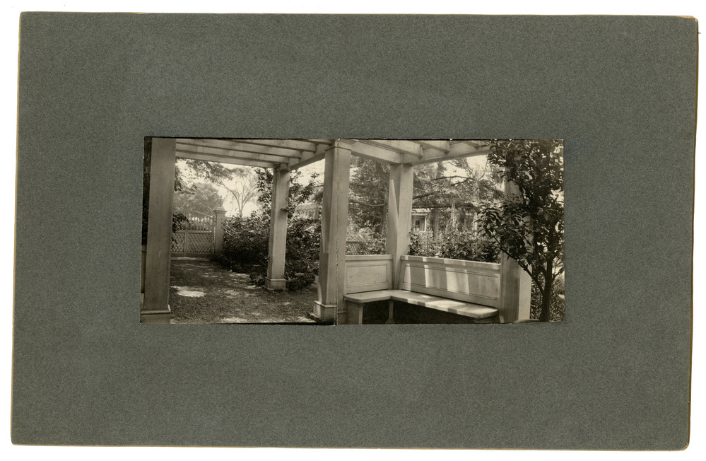 Two prints taken from inside arbor, mounted side by side to produce panoramic view of inside arbor, east garden gate, and north ell at Longfellow House. C1904-C1934. Arbor erected 1904 and removed 1932-34. Inscribed in pencil, upper right verso, "8."