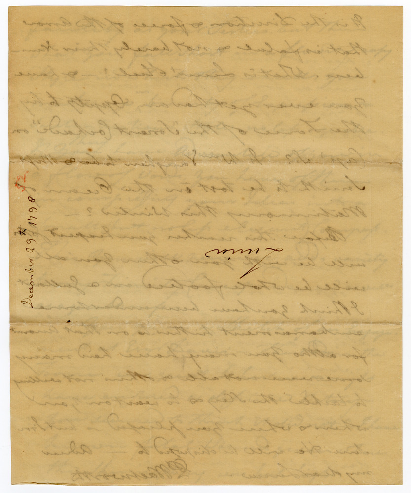 Philada 29thDecr.1798 I had not time to thank you dear Lucia for her pretty Diary ending 16th Inst: before the Closing of the days mail. I thot it advisable to send off what I had, rather than risk the whole by writing longer. And our Family Correspondence is of such a complex nature that it makes no great adds whether as strict order is observed or not, for there are but few things in it that are appropri-ate to any One; & where there is, such I trust is the Harmony of the Family, that each enjoys in a great degree what any Other does. ---------- It is true my Lucia, you don’t “fill up your paper” with so much (p. 2) faulity[sic] as your Sisters, but then what you fall short in a flowing easy Style in which they excell[sic], you make up ^in brevity of Expression & Sentintentious[sic] Style no less agreable. If you ^they have Advantage of you in a flow of words, you have them in compressing your Ideas into a small (but noless[sic] elegant) Compress. This you will perceive adds variety to my Family Correspondence as well as agreableness[sic]. You gave a sketch of an Engage-ment at Esqr Davis’- The addin[sic] the Forces was great to be sure & might have ensured a decisive Victory – You seemed to think it did not – I have known fatal Wounds given where the Skirmishing was but light. (p. 3) It is the Direction & Forces of the Arrow that is fatal & not barely their num-bers. What is Lieunt Steel? - & have you ever yet had an Oppty to try the Force of the “Sorcast Cockade” on Capt S.? Is Wm Vaughen to be & Miss Smith to be tost in the Ocean of Matrimony this Winter? – Before this reaches you I expect John will be with you & then you all will be whole footic’d[sic] in a Gallant. I think you have been under some embarrassment hither to on that amount for altho you may have had many some were not able & others not willing to tackle the sley & to wait on you when & where you pleased – but I’m sure He will be dispos’d to – Adieu my dear Lucia. P Wadsworth