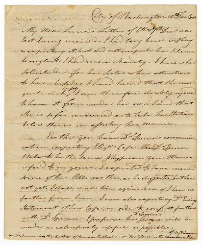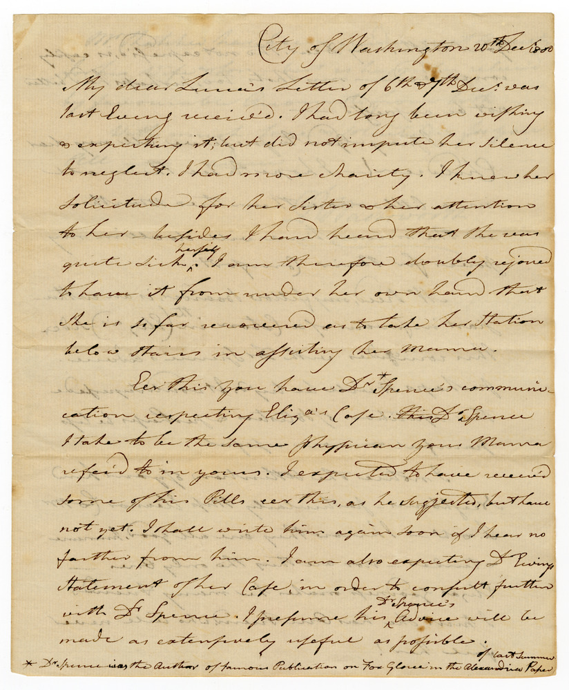 City of Washington 20th Decr1800 My dear Lucia’s Letter of 6th & 7th Decr. was last Eveng receiv’d. I had long been wishing & expecting it; but did not impute her silence to neglect. I had more charity. I know her Solicitude for her Sister & her attentions to her – besides I had heard that she was quite sick ^herself. I am therefore doubly rejoiced to have it from under her own hand that She is so far recovered as to take her Station below stairs in assisting her Mama. Eer this you have Dr* Spence’s communi-cation respecting Eliza’s Case. This Dr Spence I take to be the Same physician your Mama refer’d to in yours. I expected to have receiv’d some of his Pills eer this, as he suggested, but have not yet. I shall write him again soon if I hear no farther from him. I am also expecting Dr Irvings Statement of her case, in order to consult further with Dr Spence. I presume his ^Dr Spence’s Advice will be made as extensively useful as possible. *Dr Spence was the Author of a Famous Publication on Fox Gloree in the Alexandria Paper ^of last summer (p. 2) Your wish, my Dear, tho not express’d, is easily conceived – my thots too, perhaps had better not be express’d – I pray God to preserve all my dear Children! – I hope to see them all in a little more than two Months in the mean time will do all in my power for their Comfort. Mr Reed, my fellow Boarder, is an enthu-siast in favour of a Ceton[sic] in ^the (Eliza’s) side + this coin^csides with Dr Spence’s Advice. Perhaps It will be try’d. It would supersede the repetition of Blisters & perhaps be less painful & more useful. I notice the Attention of your Neighbours – particularly Miss Eleanor C & Mr L & W – I know they are all good, humane & tender – nor are they the only Ones – Eliza’s goodness makes her many Friends I trust she has One Friend, who will never fail her!