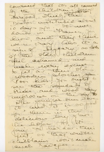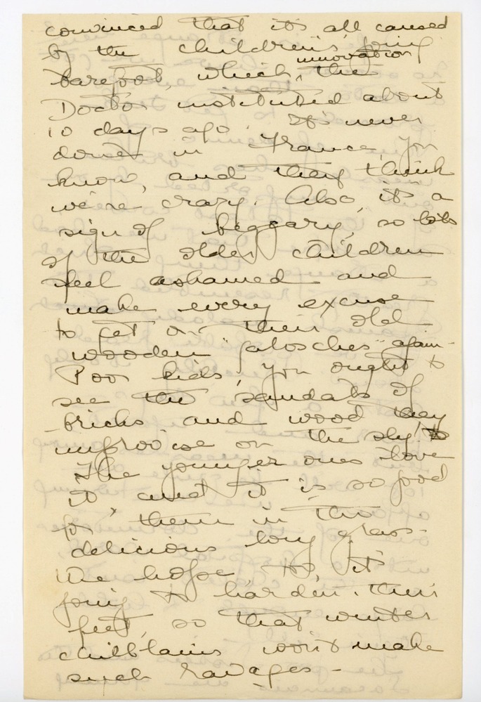 The poor Sisters and the Lacaunais are [p. 4] convinced that it’s all caused by the children’s’ going barefoot, which ^innovation^ the doctor instituted about 10 days ago. It’s never done in France, I know, and they think we’re crazy. Also, it[sic] a sign of beggary, so lots of the older children feel ashamed and make every excuse to get out their old wooden “galoches” again. Poor kids, you ought to see the sandals of bricks and wood they improvise on the sly! The younger ones love it, and it is so good for them in the delicious long grass. We hope, too, it is going to harden their feet, so that winter chilblains won’t make such ravages[?] —