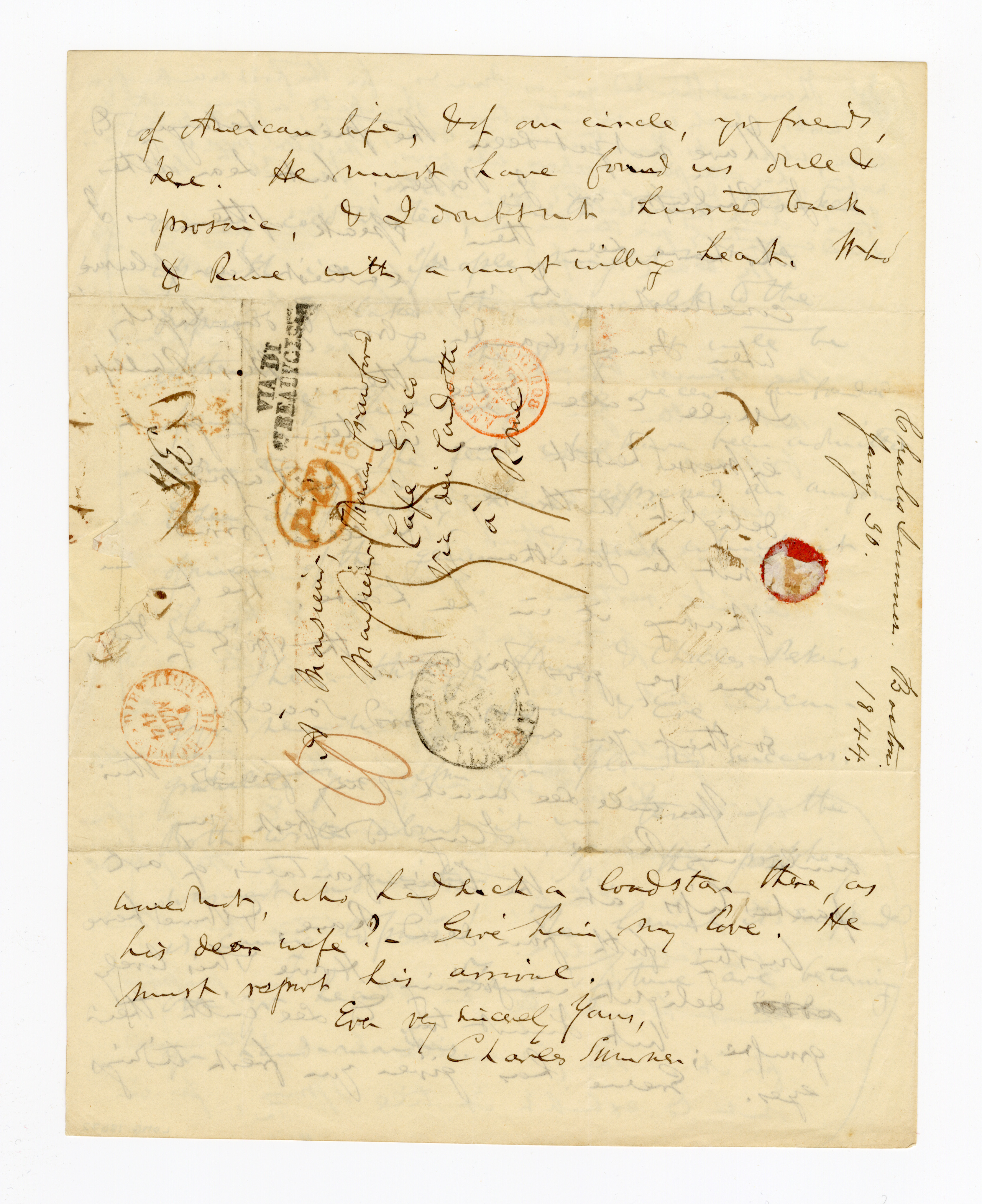You will see much of my friends this winter in Rome. I long to refresh my parched lips at the living fountains of art—bursting forth from dead Rome, & should have [crossed out: added] delight in joining Howe & his lovely groupe; but I must try to see with their eyes. Greene has given you fresh tidings [p. 4] of American life, & of our circle, yr friends, here. He must have found us dull & prosaic, & I doubt not hurried back to Rome with a most willing heart. Who would not, who had such a loadstar there, as his dear wife? – Give him my love. He must report his arrival.