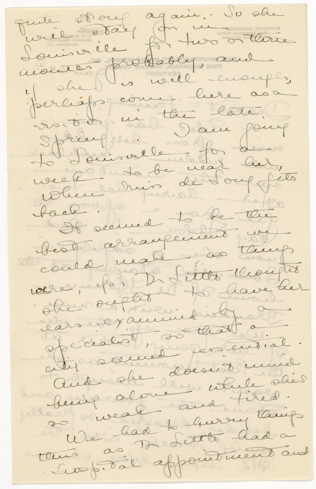 Ede has gone – risen from her bed and ridden on muleback over the mountain after having had to be fed from a spoon the day before! And now she is safely in Louisville, staying at the home of Dr Florence Brandeis, with a nurse. We gave up the idea of her going north at the last moment, as she wasn’t well enough to stand the journey and besides, dreaded so greatly going back into the old life before she was (p.2) quite strong again. So she will stay on in Louisville for two or three months probably, and if she is well enough, perhaps come here as a visitor in the late Spring. I am going to Louisville for a week to be near her, when Miss de Long gets back.