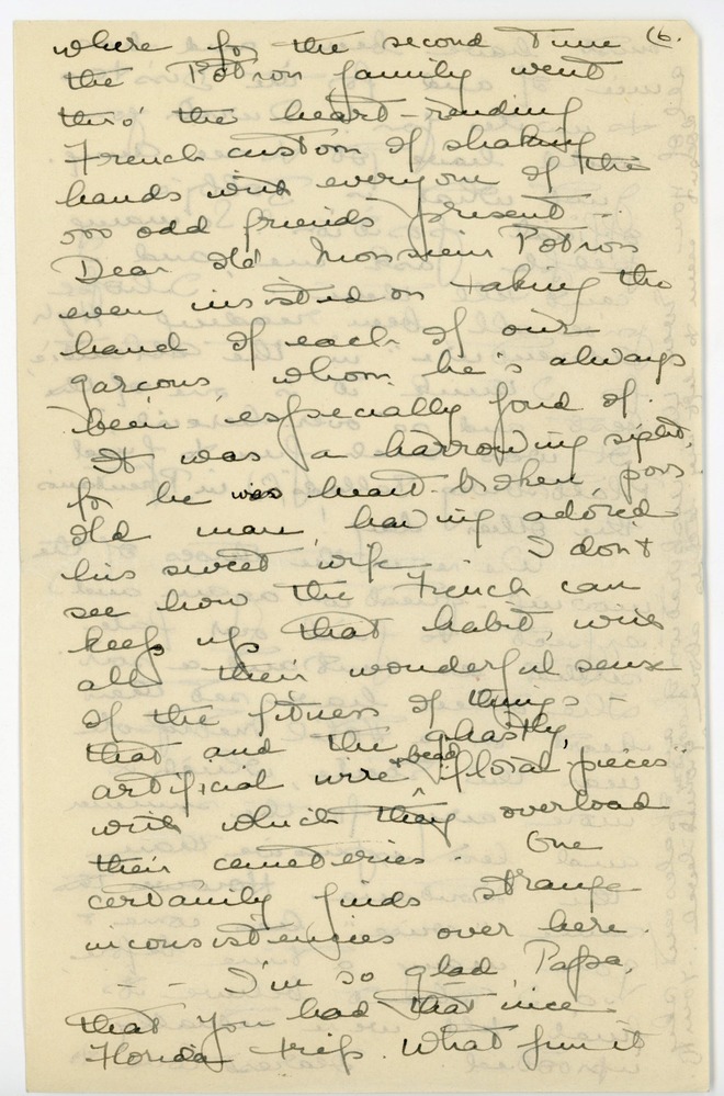 Last night my filleul, who’s just been “reformé” d[?], (page 6) came for dinner and movies, where we saw the Americans being decorated by Clemenceau at the front! I hope all these war movies get quickly over to you, for I know of nothing that helps one better to realize and visualize the front-line life. It’s great seeing them with a militaire, [crossed out: too], for he explains so many fine points.