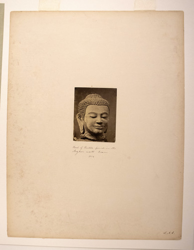 Statue of head of Buddha from Angkor Wat in Cambodia. Features include broad mouth, downcast eyes, elongated ears. Stone is carved to give the impression of curly hair and possibly an up-do. | Inscription: "Head of Budda found in the Angkor watt . . . Siam / 1874 / C.A.L." on front in ink in cursive by Charles Longfellow. | Dates and notes: 1874 as given in inscription.