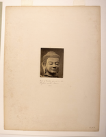 Sepia photograph with an inscription representing the head of a Buddha sculpture.