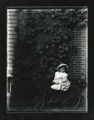 Young Anne Longfellow Thorp in a white hat and dress sits on a tricycle in front of an ivy-covered wall. Notes: 23 May 1897 as given in inscription of album print. Associated Materials: 3007.2/1-23 #12 corresponding print in album.