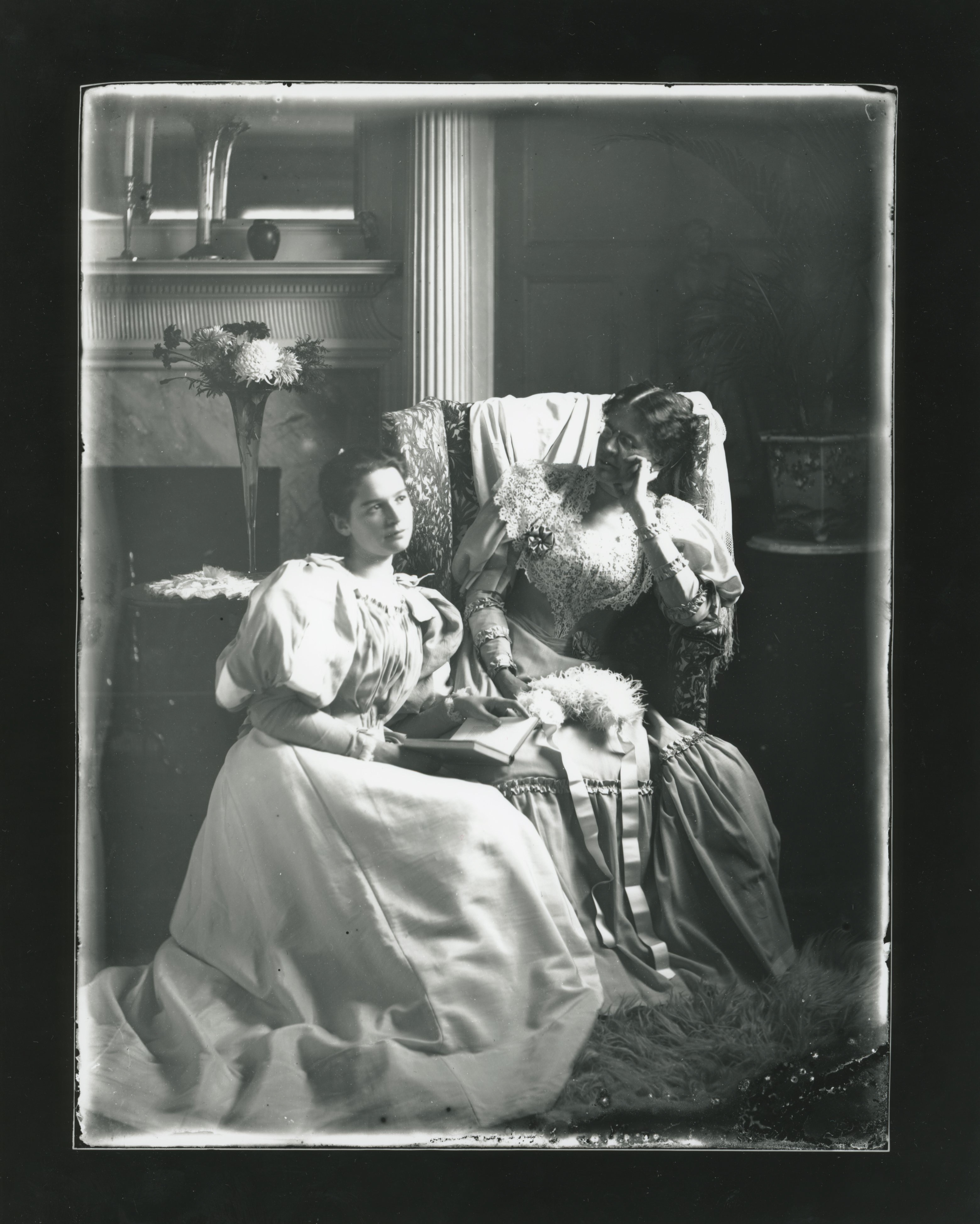 Harriet Brooks is seated and wearing eyeglasses. Margaret Brooks on the lower seat looks up from her book. Notes: C1900. Margaret Brooks b. 1871, (her mother Harriet who married John Brooks, b. ca. 1841). "Mrs. Brooks and Margaret" is one of the Joseph Gilbert Thorp Jr. labels on the negatives box.