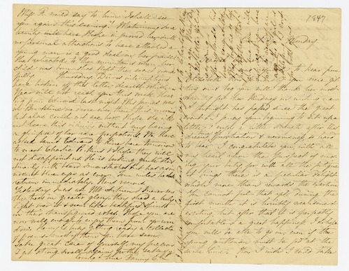 I was rejoiced to hear from Elisabeth how famously you were getting on & beg you will thank her most warmly for her kindness in writing me. A fortnight has passed since the great event & I fancy you beginning to sit up a lite & enjoy a little strength after that dreary time of prostration & nervousness, so hard to bear. I congratulate you, with all my heart, upon the prospect of nursing your baby, for with all the fatigue it brings there is a peculiar delight which more than rewards the exertion. You cannot feel that yet, - during the first month it is horribly wearisome & exciting, but after that it is perfectly comfortable & a great happiness. I do hope you will be able to go on, even if the young gentleman must be fed at the same time. How I wish I could take [p. 2] a chair by your bed-side, my darling, & enjoy your convalescence & admire your new treasure. I am very glad your nurse is so satisfactory, for it is a great help to one’s recovery to have a quiet person in the room. I shall soon hope to have a few lines from your own hand, to satisfy my anxiety that you are gaining as fast as you ought. I was sorry my long letter came just when it did, for you should not have heard it all at that time. I take it for granted you had the comfort of ether through your prolonged suffering, & trust it was more effectually given than before. Miss Alexander was here a day or two ago to enquire after you, & received the good news gladly. She told me of Mrs Cunningham’s strange dislike to her child, and think it is beginning to soften a little, as she has shown some interest lately, in its clothes. It must be a kind of insanity. Miss A has seen much of the poor little thing this summer, as it was in her neighbor [p. 3] hood, & has got quite attached to it. The family are all fond of it, & it has been to pass the day at the grand house!