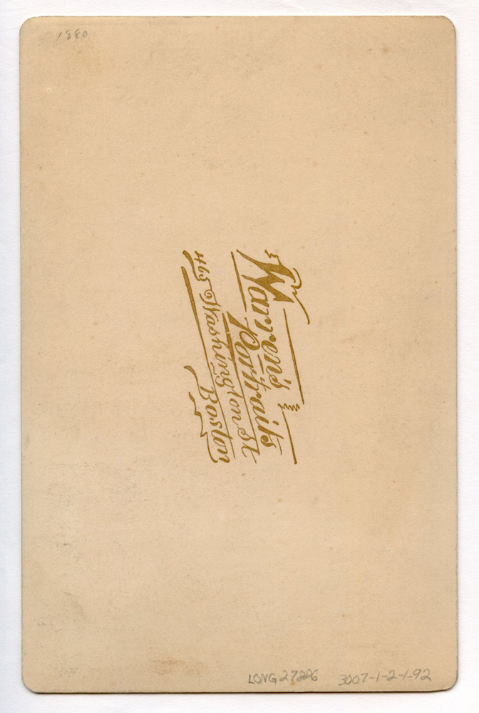 Back of a cabinet card. Front shows Henry Wadsworth Longfellow three-quarter view to his right. Head visible with shoulders fading into background. Inscription: "1880" verso in pencil probably in Thomas de Valcourt's handwriting. Photographer stamp includes "Warren's / Portraits / 465 Washington St. / Boston." in gold ink verso. "Warren" stamp in gold ink also below image. Notes: [1878] for image. Photograph may have made in 1880 as inscription suggests. Image made at same photograph session as photograph dated 1878. Associated Materials: 3007-1-2-1-85 same image without background. 3007-1-2-1-83 -85 likely shot at same photography session.