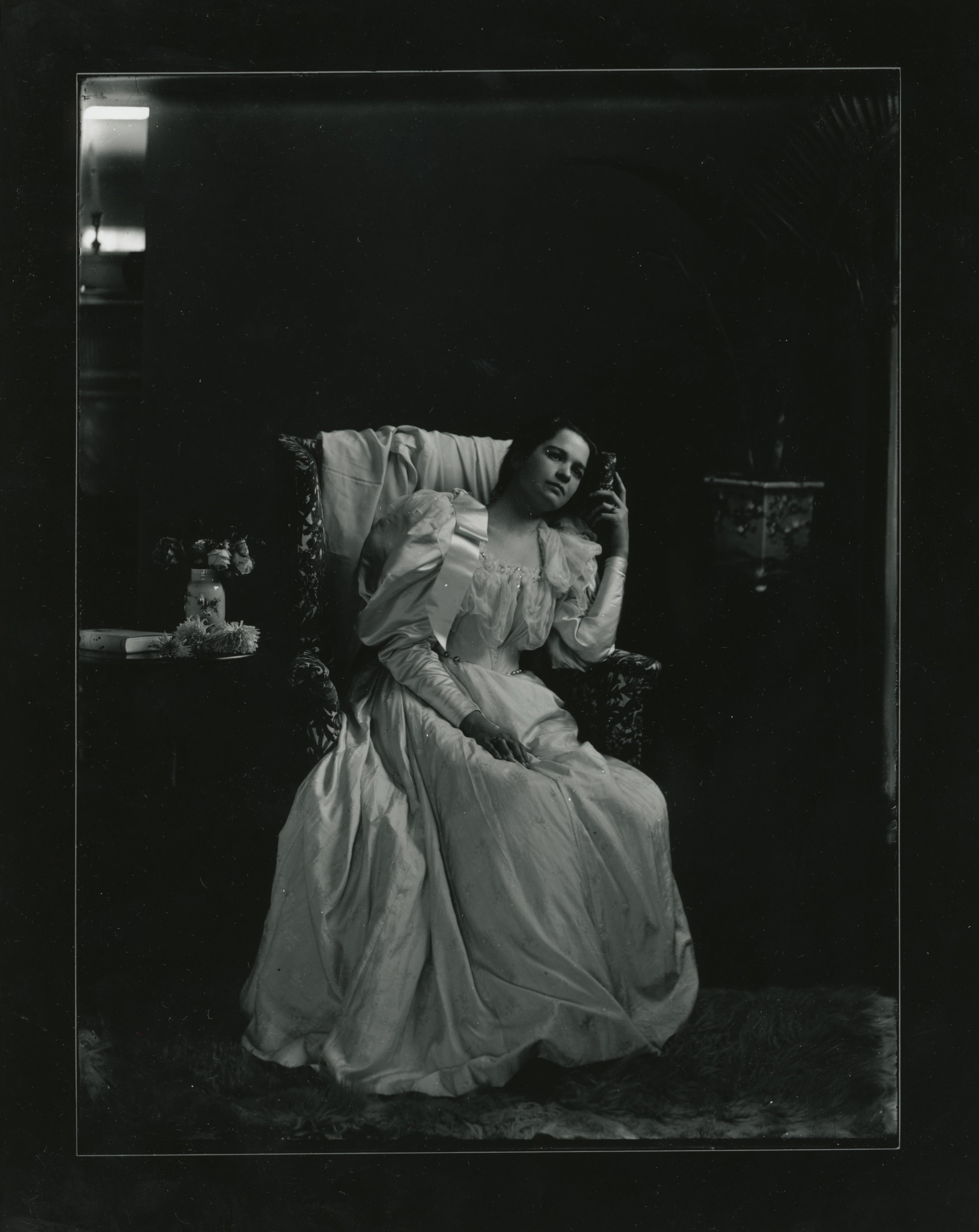 A young white woman dressed in a puffed-sleeve dress sits in an upholstered chair. She rests her head on the left side of the back of the chair.