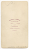 Back of a carte-de-visite. Front shows a stone or marble statue memorial with Dante on top, one figure bottom left carrying staff and crowned with star, other figure bottom right weeping over a casket. It is placed in an interior in front of arched niche. Carved inscription including 1829 in Roman numerals barely visible. Inscription: Photographer stamp includes printed in purple ink under image and verso "Fratelli Alinari, Firenze." Notes: C1865-C1870 because of general format and assumed creation of statue (1865). Originally filed in Dante Material.