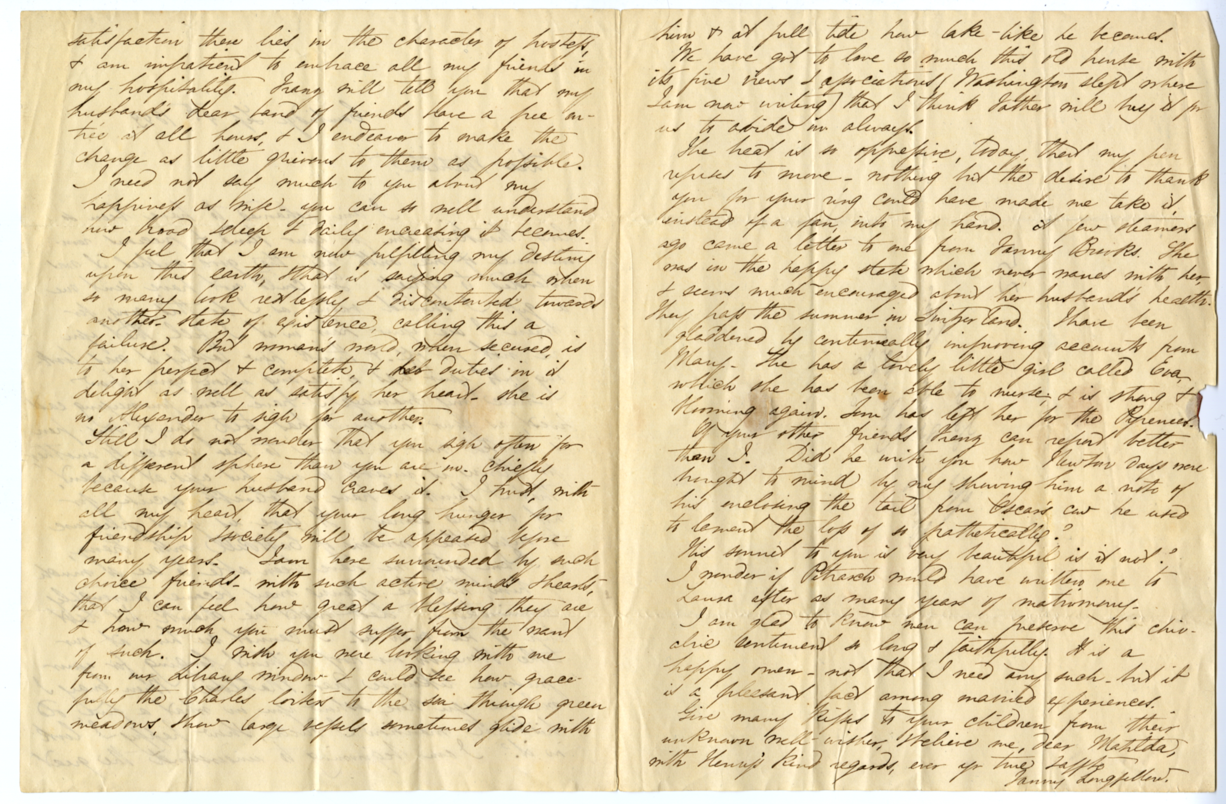 Since my marriage I have been journeying east & west, as your husband has told you, & my pen is devoted now so wholly to the service of another, for Henry is unable to use his eyes at present, that I think I have a tolerable excuse for not writing sooner. It gave us great pleasure to enjoy the wonders of Catskill with Franz, & I am glad we have been able to see so much of him, that he &Henry may become thoroughly acquainted. Last night he drank his last cup of tea with us. I cannot see him at our table beneath our roof without longing for your presence likewise dear Matilda. When may I welcome you here &show you in what a fine, old historical mansion I dwell, &how happy I look in it? I am beginning to understand the great [p. 2] satisfaction there lies in the character of hostess, & am impatient to embrace all my friends in my hospitality. Franz will tell you that my husband’s dear band of friends have a free entrée at all hours, & I endeavor to make the change as little grievous to them as possible. I need not say much to you about my happiness as wife. You can so well understand how broad & deep & daily increasing it becomes. I feel that I am now fulfilling my destiny upon this earth, &that is saying much when so many look restlessly & discontented towards another state of existence, calling this a failure. But woman’s world, when secured is to her perfect & complete, & her duties in it delight as well as satisfy her heart—she is no Alexander to sigh for another.