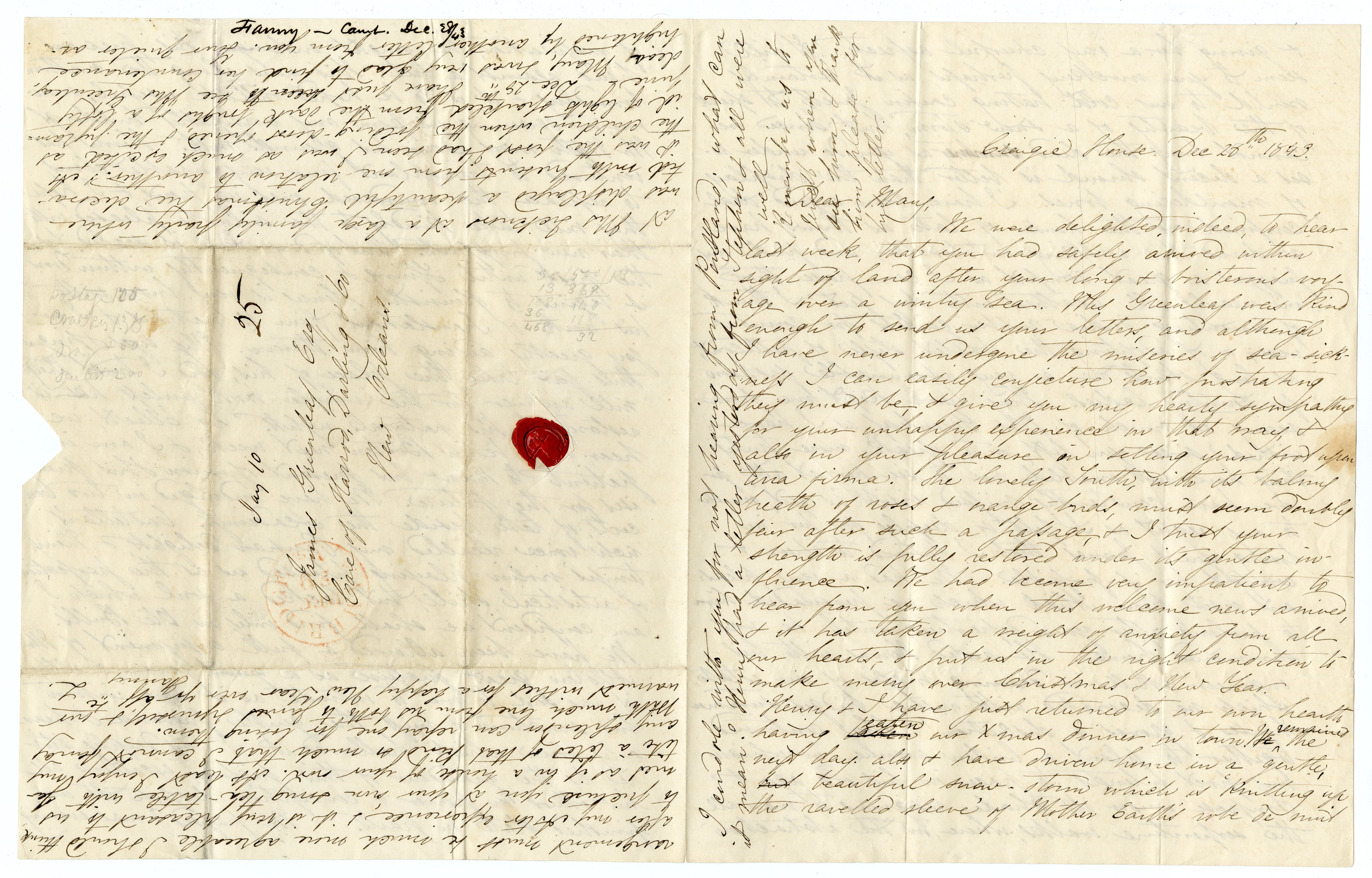 We were delighted, indeed, to hear last week, that you had safely arrived within sight of land after your long & boisterous voyage over a wintry sea. Mrs Greenleaf was kind enough to send us your letters, and although I have never undergone the miseries of sea-sickness I can easily conjecture how prostrating they must be, & give you my hearty sympathy for your unhappy experience in that way, & also in your pleasure in settling your foot upon terra firma. The lovely South, with its balmy breath of roses & orange-buds, must seem doubly fair after such a passage, & I trust your strength is fully restored under its gentle influence. We had become very impatient to hear from you when this welcome news arrived, & it has taken a weight of anxiety from all our hearts, & put us in the right condition to make merry over Christmas & New Year. Henry & I have just returned to our own hearth having [crossed out: broken] eaten our Xmas dinner in town. We remained the next day also & have driven home in a gentle, [crossed out: but] beautiful snow-storm which is ‘knitting up the ravelled sleeve’ of Mother Earth’s robe de nuit [p. 2] & giving her a very cheerful aspect. It will seem to you mockery perhaps, as it certainly would to my cold-hating cousin Jewett, to speak of the beauty of a snow-storm, but since we cannot bury the dead summer, as you do, under roses a decent shroud is better than the display of mouldering bones. I have been a good deal confined to the house of late as thaws have rendered the walking intolerable, and find my piazza a great comfort as I can pace there in nearly all weather with dry feet. I think of inventing india-rubber gaiters for country wear, or of adopting the ballet style of petticoat, as long skirts are a very abominable fashion for country ladies. They have kept me from seeing as much of Mrs Greenleaf as I have wished since you left, - or to speak more truly they have not enabled me to see her at all, for we have constantly missed visits as yet, much to my regret as I felt so deeply for her in losing you & James that I desired to cheer & comfort her if possible. We had a very pleasant visit from Alick which we persuaded him to prolong, after your departure, until he was summoned home. He aided Henry with his engineer skill in drawing maps of our estate which we decorated with rustic bridges, summer houses & groves à discretion! They contrived together to plant a linden avenue in which my poet intends to pace in his old age & compose under its shade, resigning to me all the serpentine walks, where, in the abstraction [p. 3] of inspiration, he might endanger his precious head against a tree. This runs along the northern boundary & it is to be hoped will be useful, moreover, in screening from us any unsightly building Mr Wyeth may adorn his ground with. Henry has ventured to transplant four very sizable elms, to replace the murdered ones in front, & I hope they will take kindly to the soil & be pleased with their new prospects. Out-of-door work is sealed by the frosts until Spring, & consequently within doors it begins to flourish. Henry is very busy with his work of Translations from 10 nations, & I enjoy greatly aiding him therein. My eyes & fingers thus far take the place of his, and I trust they will answer for the whole book, unless he is restored to his natural rights. Dr Elliott, we hear, is to be in Boston next week, & I am i[m]patient to know his present opinion & his pro[m]ises for the future. We have indulged in two Concerts, of late, beside the Academy’s. Castellan’s rich voice recalled my Parisian delights, & Vieuxtemps’ violin-playing pleased us as the perfection of artistical skill, but lacked a soul which I am confident we shall find only in Ole Bull’s. We have been allowed a full enjoyment of Mr Allston [sic] great picture as a [crossed out: great] favour, & altho’ it was sad to me to intrude, as it were, within his sanctum & miss the gentle presence & heavenly voice which hallowed it. I was deeply stirred by the grandeur of this picture, excelling all his others in power & conception despite its unfinished state in parts. We passed X mas evening [p. 4 bottom] at Mrs Ticknors at a large family party where was displayed a beautiful Christmas tree decorated with presents from one relation to another. As it was the first I had seen I was as much excited as the children when the folding-doors opened, & the pyramid of lights sparkled from the dark boughs of a lofty pine – Dec 28th I have just been to see Mrs Greenleaf, dear Mary, & was very glad to find her countenance heightened by another letter from you. Your quieter ar [p. 4 top] rangement must be much more agreeable I should think, after my Astor experience, & it is very pleasant to us to picture you at your own snug tea-table with James as if in a house of your own. At least I enjoy my tête à têtes of that kind so much that I cannot fancy any splendor can repay one for losing them.