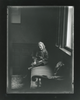 Priscilla sits on a window seat on the second floor landing of the Thorp house at 115 Brattle Street with her leg resting on the seat. She smiles at the viewer. Notes: [1901], date given to a corresponding album image.