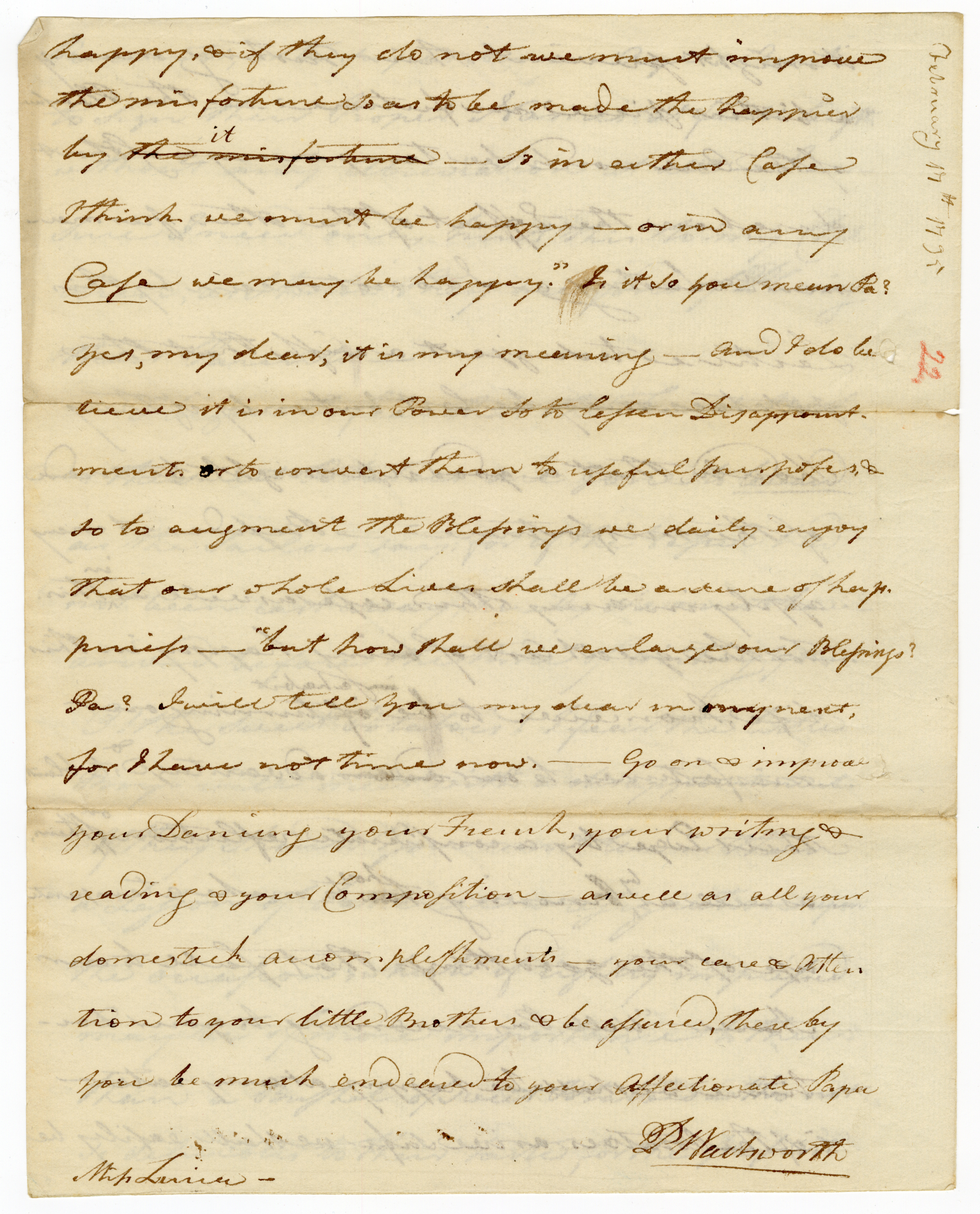 Philadelphia 17thFeby1795 My dear Lucia Yours of 4th Inst: gave me the more Pleasure as it was the only One I receiv’d Yesterday From the Family – It is true there was One accompanying yours sign’d H Wordsworth, which I should have thot had been from your Brother Harry had it not been for the Name. Surely my Son Henry Wadsworth would not have changed his Name without consulting his Papa about it, or at least giving him Notice of the Alteration. I observe that my Children often abre-viate[sic] their Christian Names when writing to their Papa – I believe it is partly my own fault, for I do not recollect to have in-structed them otherwise – but I believe the Rule is when Children write to their - (p. 2) Parents, or to superiors in Age or Rank to sign their Proper Names at full length without any Abreviation[sic] at all – I am sure I need only hint this to my Chil-dren, as I know they are fond of Pleasing their Parents – I begin to fear that the French Books & the Sweet Potatoes are gone to leeward as the Sailors say; for if the Vessel had not been cast away, surely she must have arived[sic] before the time of writing Yours. O! the Sweet Potatoes! I fear the little Boys will meet with a disappointment. If they should You must learn them a Lesson of Patience & resignation upon the occasion; which if rightly impressed may be of more importance to them than a Bushel of sweet Potatoes – tho not so delicious to their taste for the present (p. 3) it might prevent their Tasting many a bitter piece in future – the Pleasure of the One would be temporary & of short duration, the Effect of the other perma-nent & lasting. I do not mean by this Lecture to suggest a wish that the potatoes may be lost; but only if they should, that a good use might be made of the misfortune – Believe it may apply in any other case as well as ^ in this. For the great Art of being, happy in this life, I conceive to be ^ in a habit of turning our misfortunes to our advan advantage, ^ & to blunt their Edge by a considerate reflection ^ on them, as well as ^ by knowing too ^ how to make a temperate use of the good things that fall to our Share – “Well, Pa, according to your Doc-trine we shall be happy at any rate – if the Potatoes arrive safe we shall easily be (p. 4) happy, & if they do not we must improve the misfortune so as to be made the happier by the misfortune ^ it – so in either Case I think we must be happy – or in any Case we may be happy.” Is it so you mean Pa? Yes, my dear, it is my meaning – And I do be-lieve it is in our Power so to lessen Disappoint-ments or to convert them to useful purposes, & so to augment the Blessings we daily enjoy that our whole Lives shall be a scene of hap-piness – “but how shall we enlarge our Blessings? Pa? I will tell you my dear in my next, For I have not the time now. – Go on & improve your Dancing your French, your writing & reading & your Composition – as well as all your domestick[sic] accomplishments – your care & Atten-tion to your little Brothers & be assured, thereby you be much endeared to your Affectionate Papa P Wadsworth Miss Lucia –