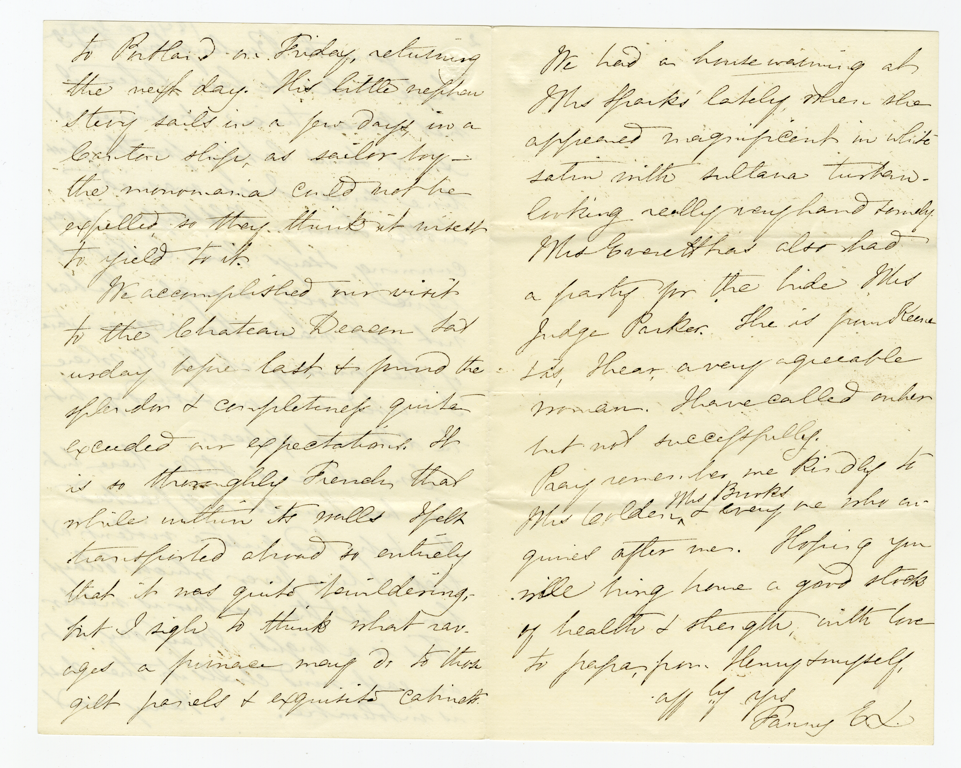 We accomplished our visit to the Chateau Deacon Saturday before last, & found the splendor & completeness quite exceeded our expectations. It is so thoroughly French that while within its walls I felt transported abroad so entirely that it was quite bewildering, - but I sigh to think what ravages a furnace may do to those gilt panels & exquisite cabinets. [p. 7] We had a housewarming at Mrs Sparks’ lately, when she appeared magnificent in white satin with sultana turban – looking really very handsomely. Mrs Everettt has also had a party for the bride Mrs Judge Parker. She is from Keene & is, I hear, a very agreeable woman. I have called on her but not successfully.
