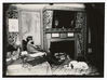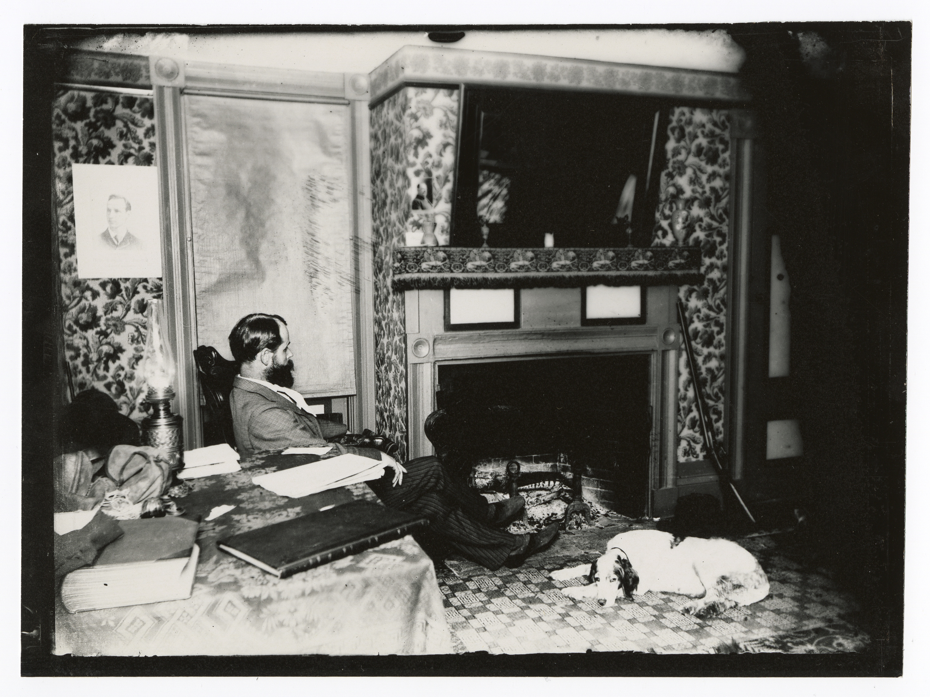 Joseph Gilbert Thorp Jr., sitting in an armchair, looks toward a fireplace where a dog, Brice (possibly an English Springer Spaniel type breed), lies. A gun is resting on the wall. The room they are in is possibly a study. Notes: [1890]. "1890" is written on the modern negative envelope. A modern non-archival print developed for Mrs. Arthur Brooks is in an accompanying envelope.