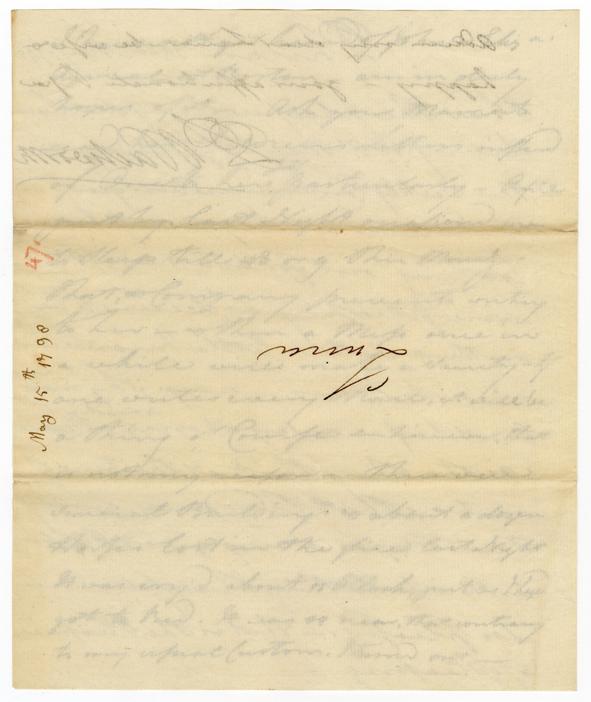 Philada 15th May1798 I had the Pleasure of my dear Lucia Diary of the 5th May by yesterdays mail. This weekly Communication from my Children is a happiness I am looking out for betimes; & it is the more pleasing as ^it seems to be written with so little Inconveni-ence to them – nay why may I not be free & say at once ^so much – Pleasure – or tho they thot at the time of writing that they were giving their Papa a very great Pleasure with which they themselves were also pleased. – That this is the Pleasure of Pleasing - (p. 2) I have not yet heard of John and Eliza Arrival at Boston – am in daily hopes of it – Ask your Mama to read her Childrens Letters instead of One to her^self particularly – A fire just by, last Night occasion’d me to sleep till & 8 or 9 this morng - that, & Company prevents writing to her - & then a Miss every once in a while will make a variety – if one writes every Mail, it will be a thing of Course – however, that is not my reason – there were Several Buildings & about a dozen Houses lost in the fire last Night It was cry’d about 11 OClock, just as I had got to Bed. It was so near, that contrary to my custom. I turned out - (p. 3) Adieu my dear Lucia – be wise & happy – your affectionate Papa P Wadsworth