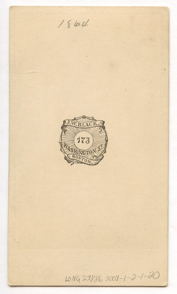 Back of a carte-de-visite. Front shows a graying Henry Wadsworth Longfellow with beard. Head and shoulders visible against blank background. Inscription: "1864" written in pencil probably by Thomas de Valcourt verso. Photographer stamp includes "J.W. Black. / 173 Washington St. / Boston." Notes: C1864 as suggested by inscription verso. Seems the same apparel as in 3003-7-2-1-17 to -19 dated C1865.