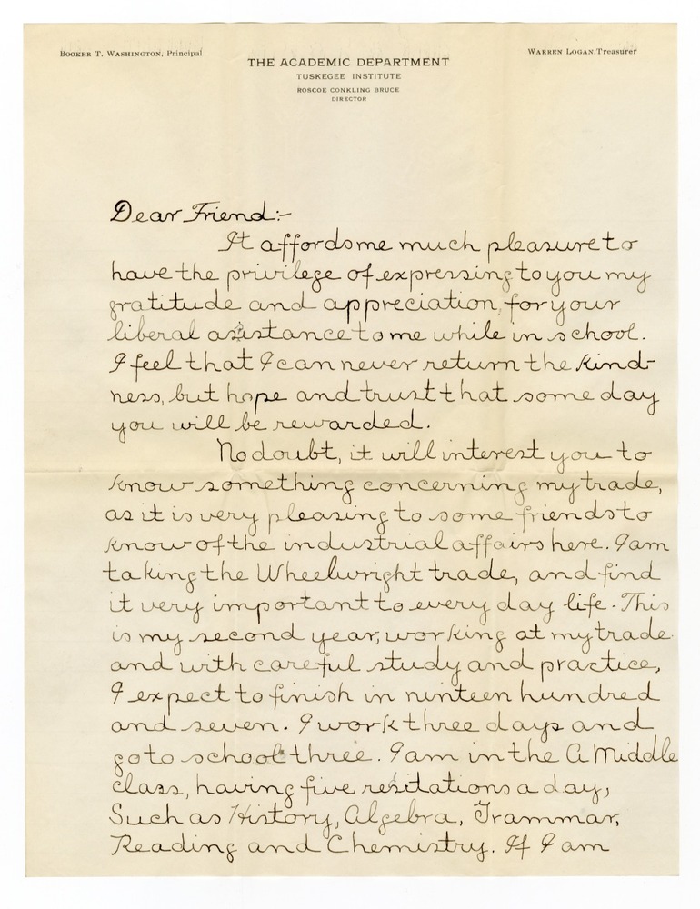 No doubt, it will interest you to know something concerning my trade, as it is very pleasing to some friends to know of the industrial affairs here. I am taking the Wheelwright trade, and find it very important to everyday life. This is my second year, working at my trade and with careful study and practice, I expect to finish in nineteen hundred and seven. I work three days and go to school three. I am in the A Middle class, having five recitations a day, Such as History, Algebra, Grammar, Reading and Chemistry. If I am [p. 2] successful in completing these five studies and other requirements of the school, I shall graduate in nineteen hundred and seven.