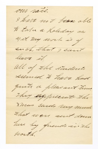 I suppose that you know that I have completed the course of study here, and am employed by the school, I hope to help Mr Washington all that I can to elevate [p. 3] our race.